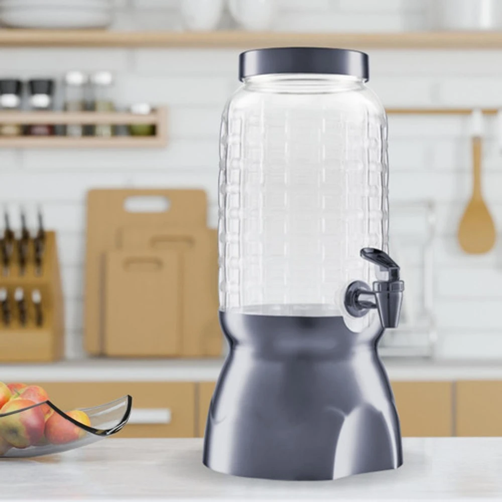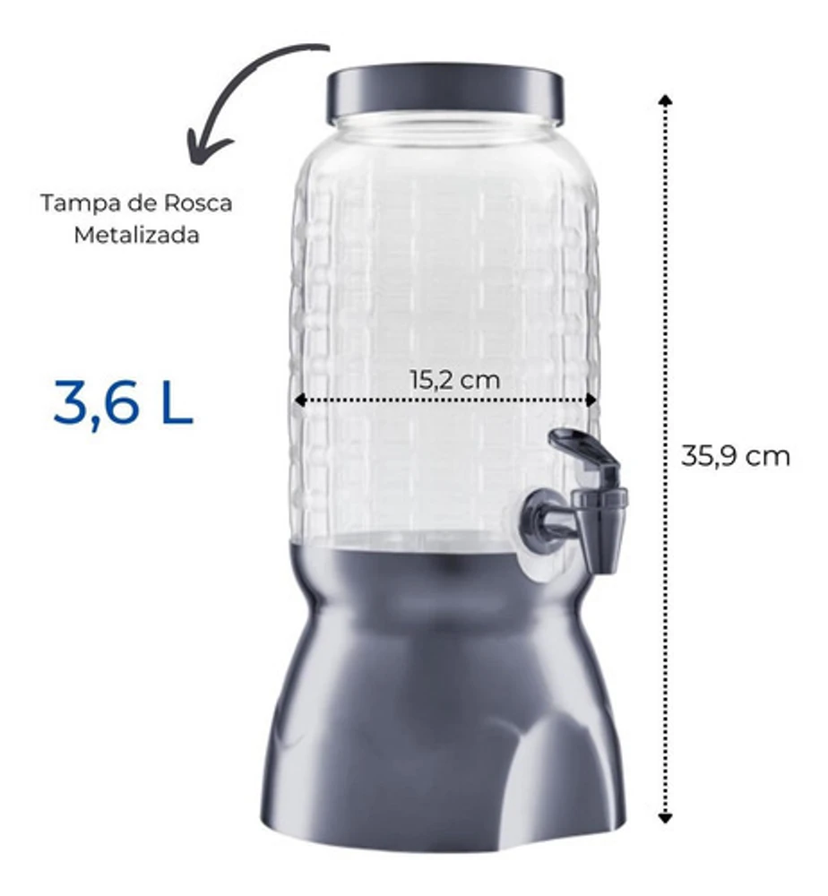 POTE WAVE 3,6LT COM SUPORTE E TORNEIRA 3,6LT CHUMBOO Pote com Torneira e Suporte Wave é ideal para armazenar bebidas em geral, como sucos, água, etc.Tem capacidade para 3,6 litros e dispenser para facilitar ainda mais o uso.O Suporte além de servir como base para o recipiente, possui acabamento metalizado, tornando-o esteticamente mais bonito e funcional, em qualquer ambiente.DADOS TÉCNICOSALTURA: 35,9CM (Com Suporte)Diâmetro do recipiente: 15,2cmMaterial: PlásticoCapacidade: 3,6LTDiâmetro da boca: 10cm