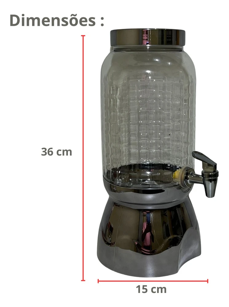 POTE WAVE 3,6LT COM SUPORTE E TORNEIRA 3,6LT CHUMBOO Pote com Torneira e Suporte Wave é ideal para armazenar bebidas em geral, como sucos, água, etc.Tem capacidade para 3,6 litros e dispenser para facilitar ainda mais o uso.O Suporte além de servir como base para o recipiente, possui acabamento metalizado, tornando-o esteticamente mais bonito e funcional, em qualquer ambiente.DADOS TÉCNICOSALTURA: 35,9CM (Com Suporte)Diâmetro do recipiente: 15,2cmMaterial: PlásticoCapacidade: 3,6LTDiâmetro da boca: 10cm