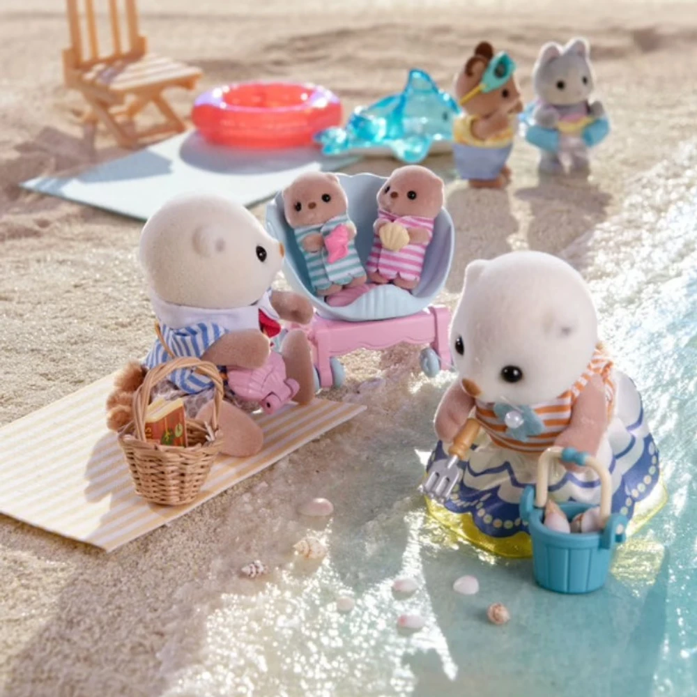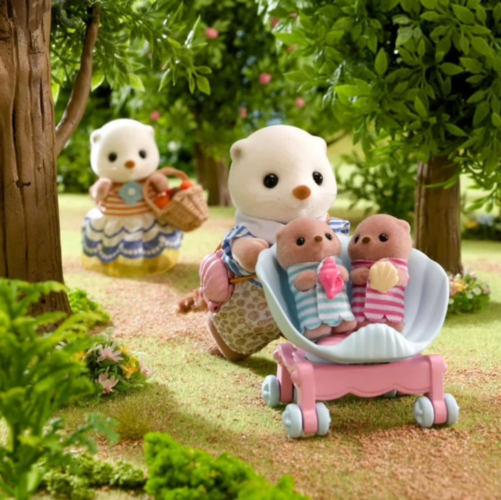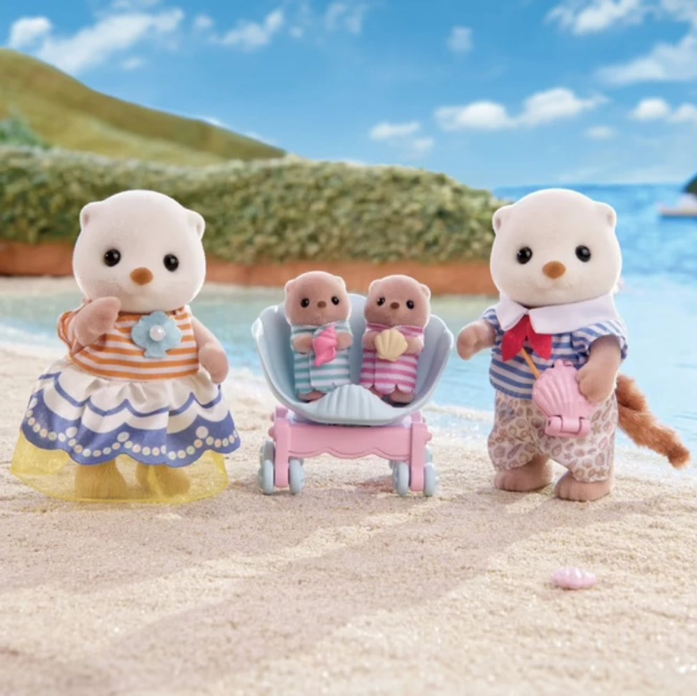 Esta família de lontras marinhas inclui 4 figuras: a mãe lontra marinha, o pai lontra marinha e o filhote de lontra marinha. Este conjunto Sylvanian Families inclui um carrinho duplo e uma bolsa de ombro em formato de concha.