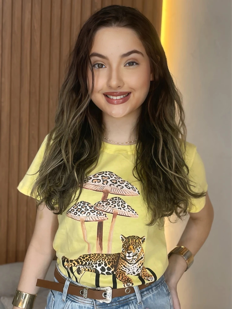 Com estampa exclusiva de onça descansando sobre a palavra “WILD” e cogumelos em tons naturais, ela traz uma vibe fashion e descolada, perfeita para quem ama looks criativos e cheios de estilo.