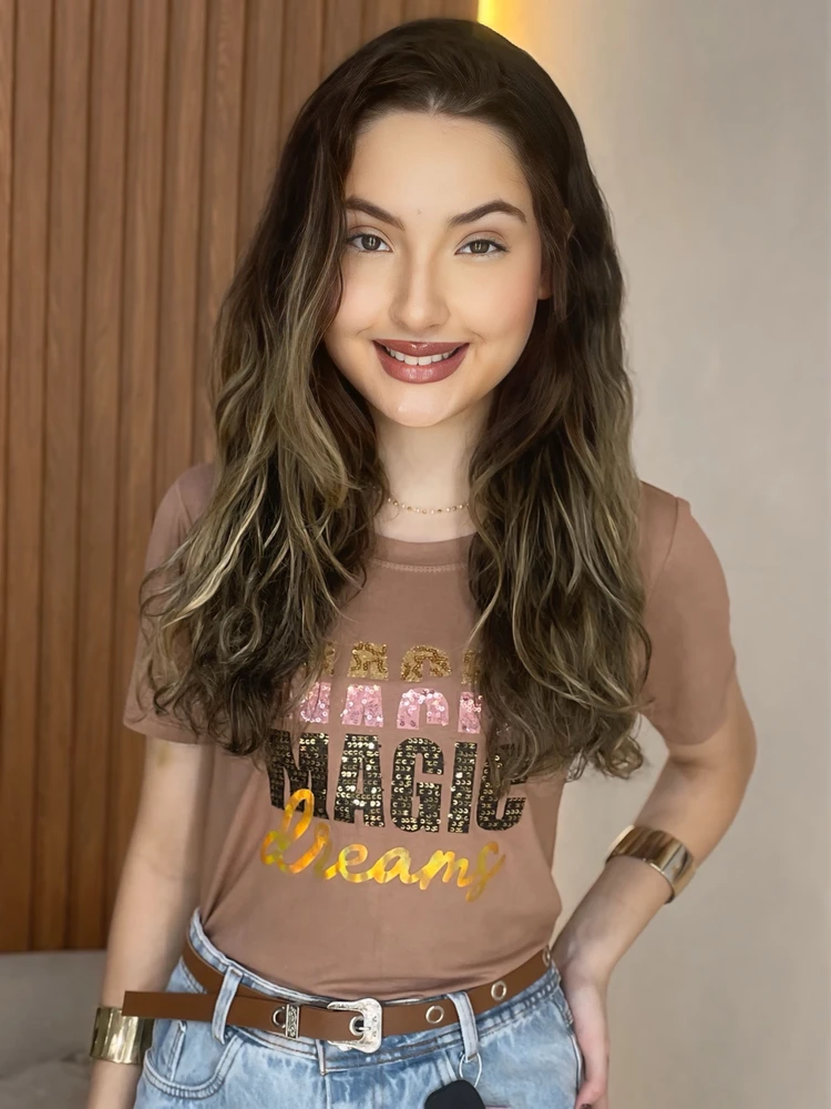 A T-shirt Magic Dreams é perfeita para quem ama aquele toque de brilho na medida certa! Com estampa trabalhada em paetês coloridos e glitter dourado, ela traz personalidade, feminilidade e um charme super “modinha”, ideal para compor looks casuais ou mais arrumadinhos.