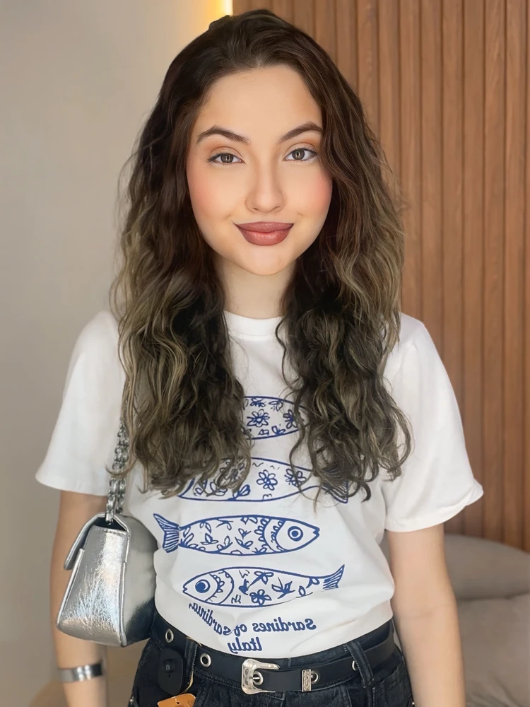 Confeccionada em malha macia, ela tem toque suave, caimento soltinho e estampa temática de sardinha — perfeita para looks casuais e modernos.