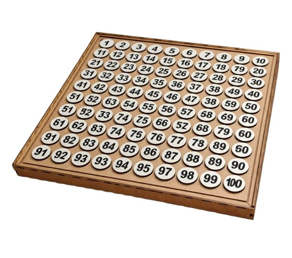 Estojo com orifícios não vazados na tampa para encaixe das fichas + 100 fichas enumeradas de 1 a 100.