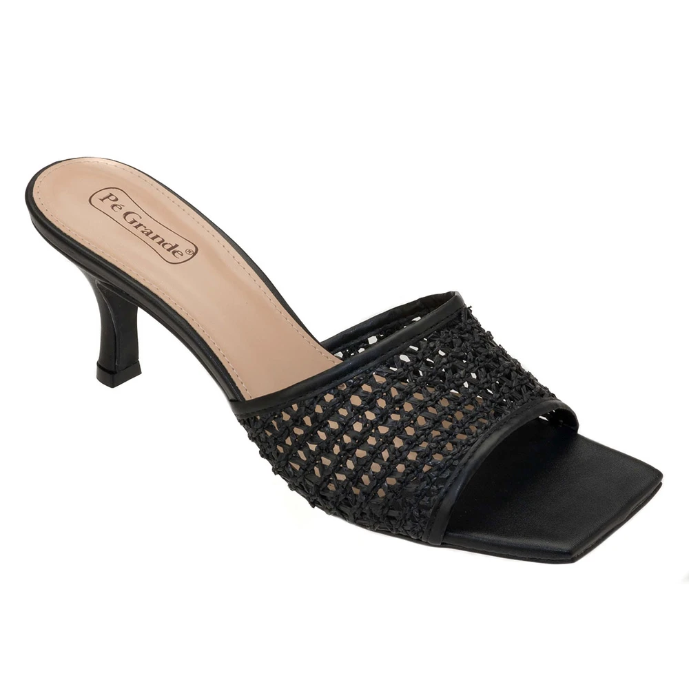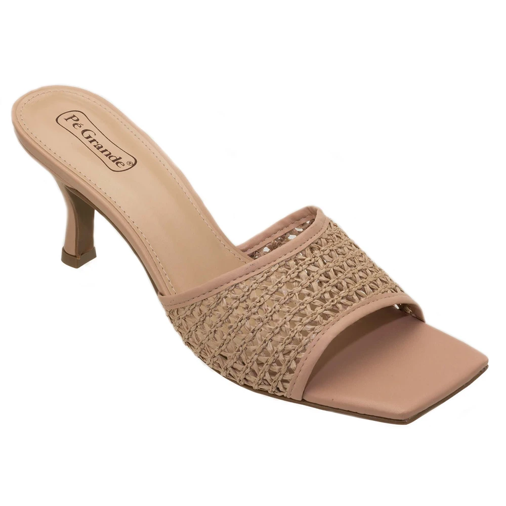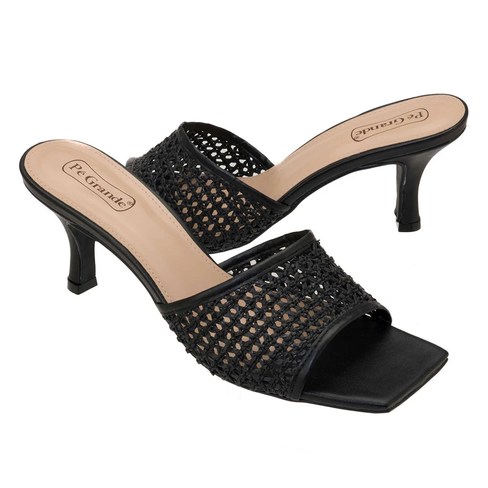 Tamanco em laminado sintético com solado em borracha antiderrapante e saltinho de 10 cm de altura.