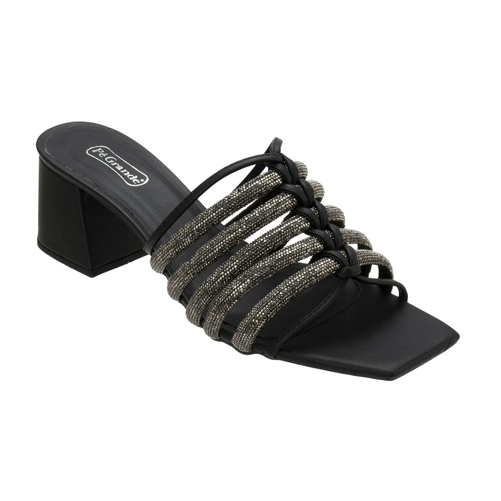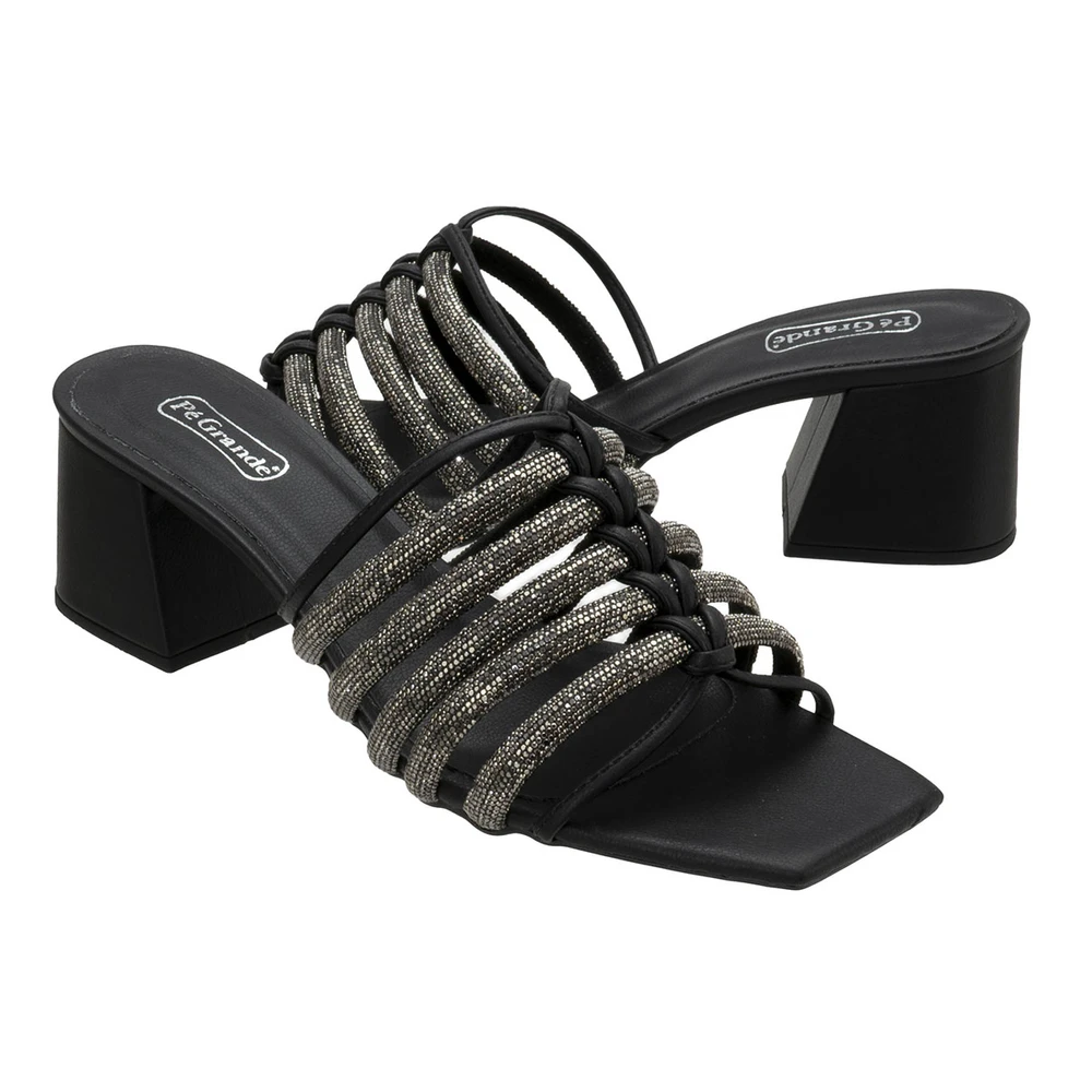 Tamanco em laminado sintético com solado em borracha antiderrapante e saltinho de 7 cm de altura.