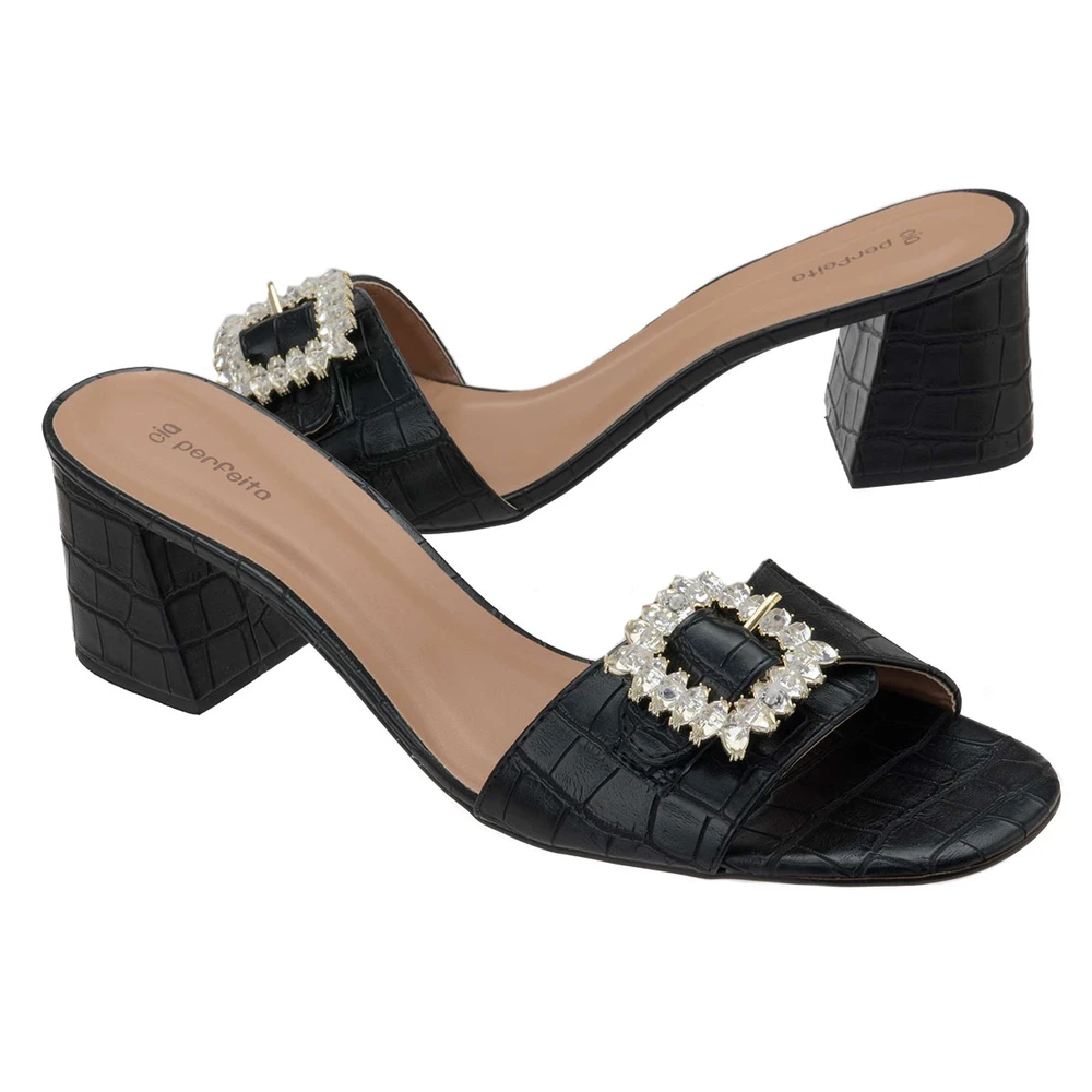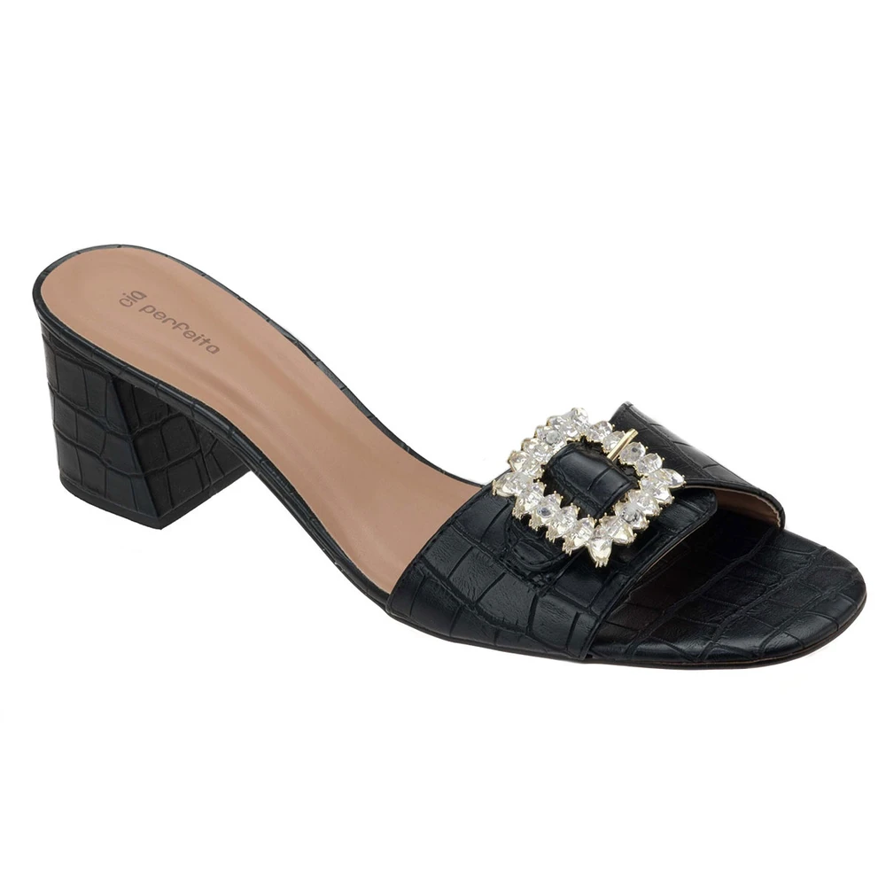 Tamanco em laminado sintético com solado em borracha antiderrapante e saltinho de 7 cm de altura.
