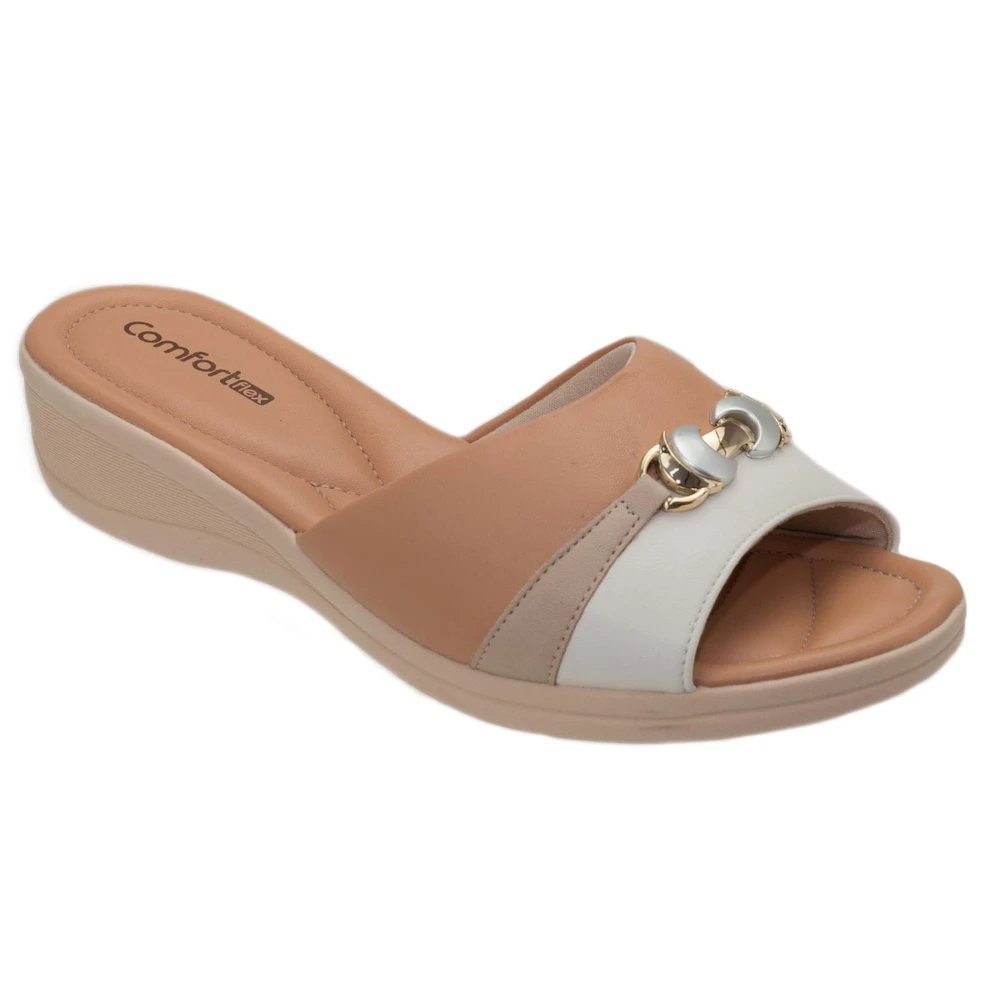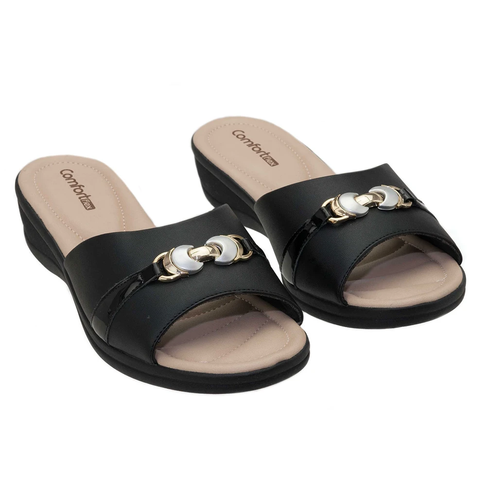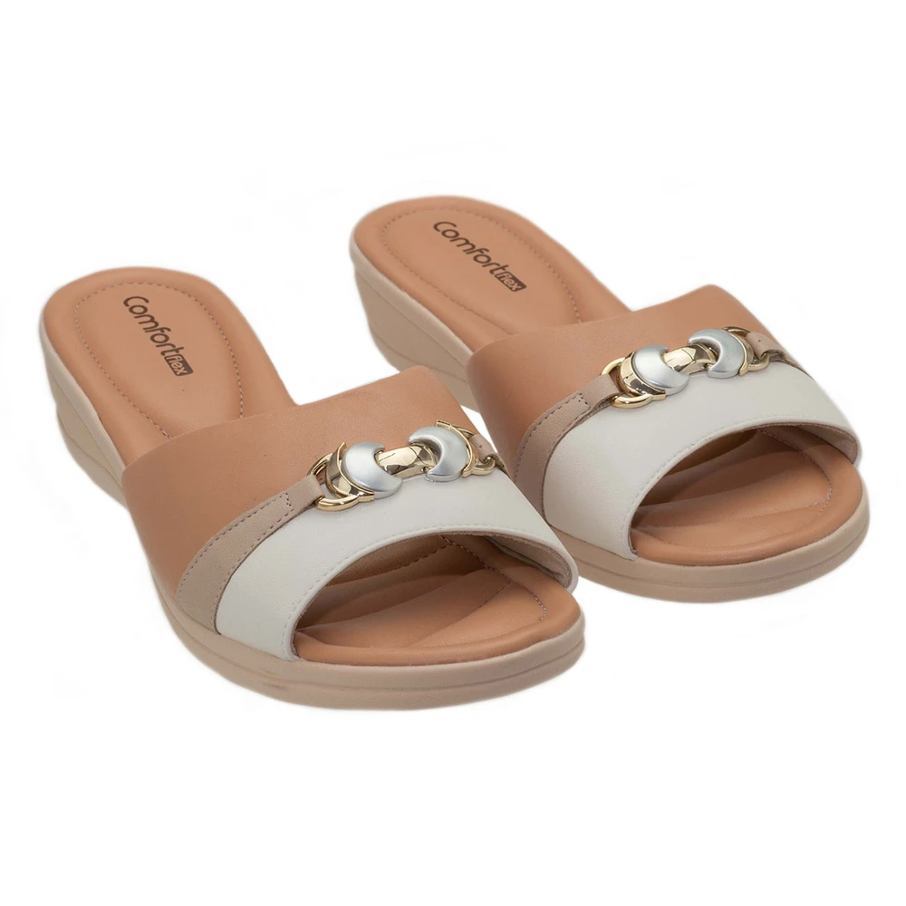 Tamanco em couro ecoógico e tecido com saltinho de 5 cm em solado plataforma antiderrapante. Um conforto superior para pessoas com alta sensibilidade nos pés.