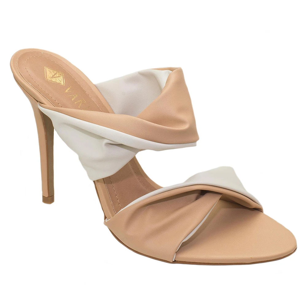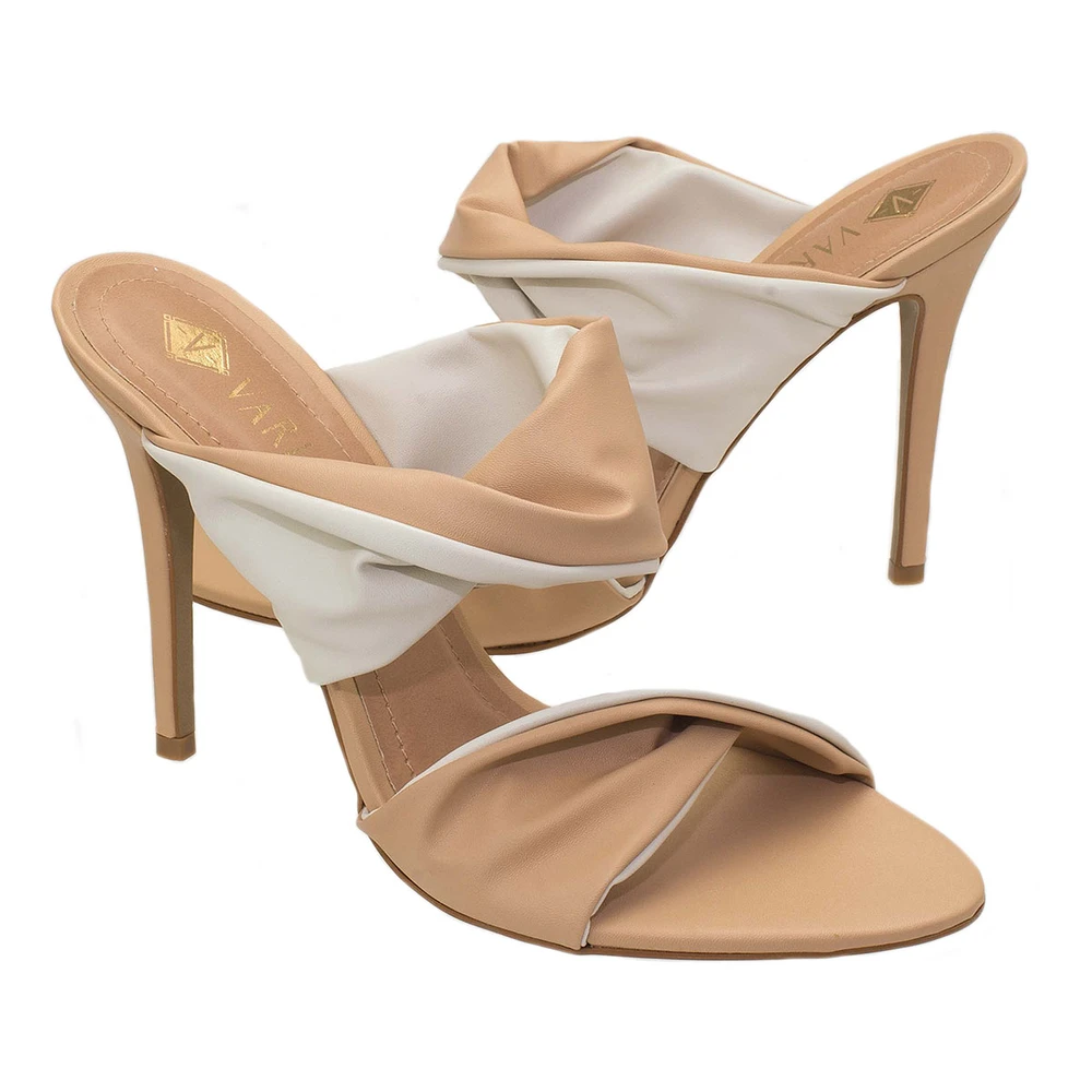 Tamanco em laminado sintético com saltinho fino de 12 cm de altura e solado em borracha antiderrapante.