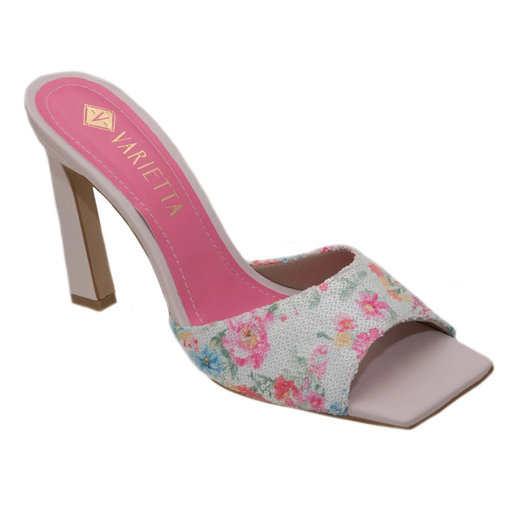 Tamanco em laminado sintético com saltinho fino de 12,5 cm de altura e solado em borracha antiderrapante. Todo glamuroso com acabamento de lantejoulas.