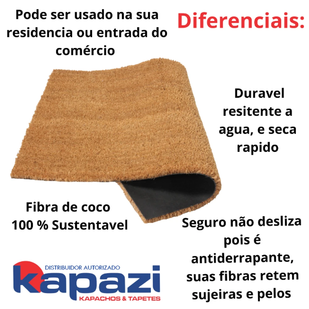 Que tal acertar na decoração da porta de entrada ou de outros espaços de forma simples e delicada? Conheça o Capacho de Porta Fibra de Coco da Kapazi, que foi desenvolvido a fim de ser extremamente funcional e eficaz. Ideal para a utilização na área externa, como por exemplo portas de entrada de residências, apartamentos, portas de comércios, sacadas, churrasqueiras, hotéis, recepção e hall de entrada.