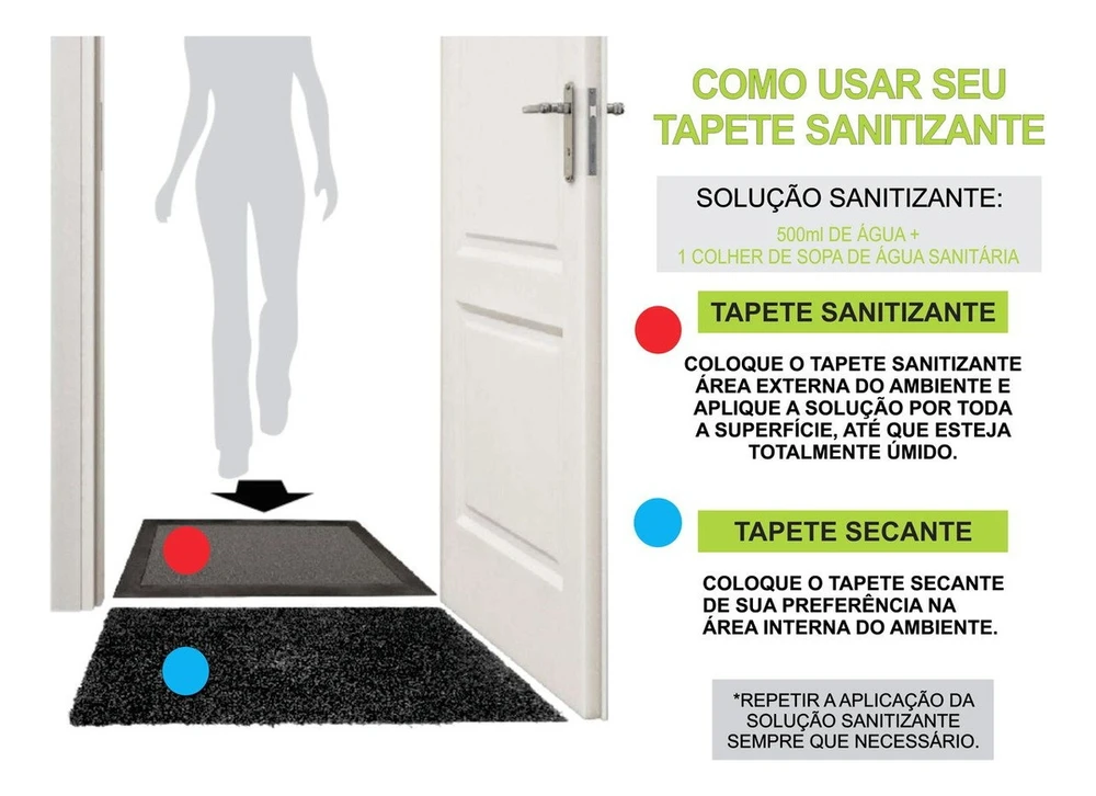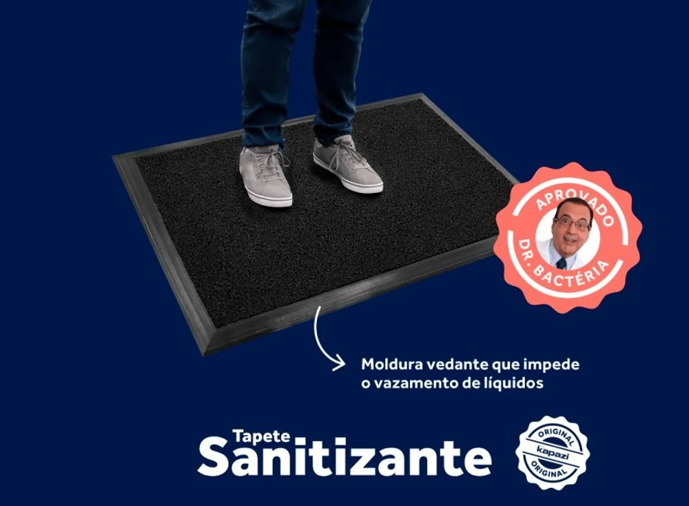 TAPETE SANITIZANTE 90 X 130 KAPAZZI. O tapete Sanitizante Kapazi é produzido em vinil (PVC), não mancha, possui borda vedante que impede o vazamento de líquidos, espessura de 10mm, é antiderrapante e antichama. ? Aplique duas vezes ao dia a solução sanitária (500ml de água + 1 colher de sopa de água sanitária) no tapete sanitizante Kapazi e deixe os vírus e bactérias da porta pra fora. ? Mais saúde, segurança e proteção para você e sua família. ? Nova Base ? Máxima Resistência ? Máxima Performace O único com moldura vedante, sem emendas. Informações Adicionais Espessura 10mm Material 100% PVC Cores Preto Antiderrapante Sim