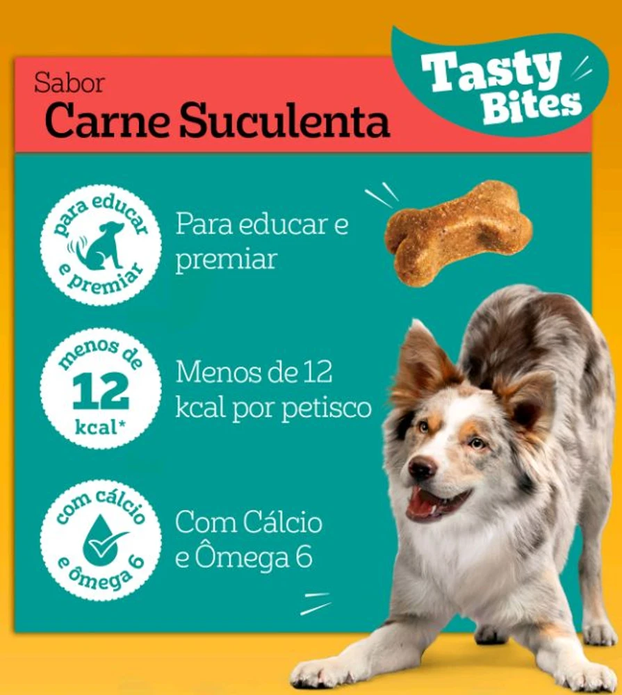Tasty Bites , é um petisco macio e delicioso que seu cão vai adorar! Ofertar em forma de agrado , treinamento e recompensa.