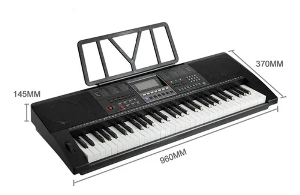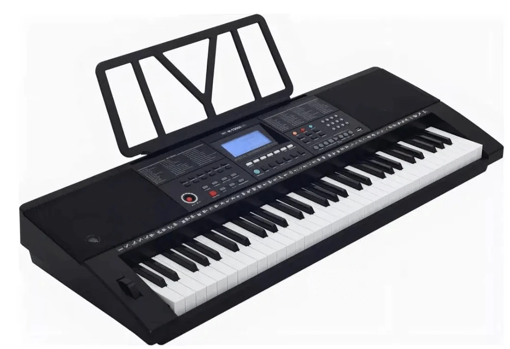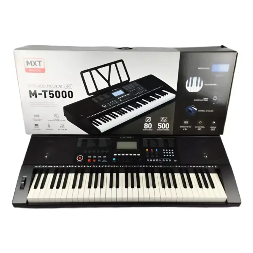 Teclado arranjador com 61 teclas estilo piano sensíveis ao toque, ideal para aprendizado e expressão dinâmica.