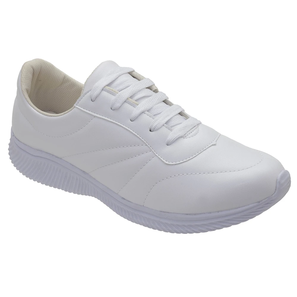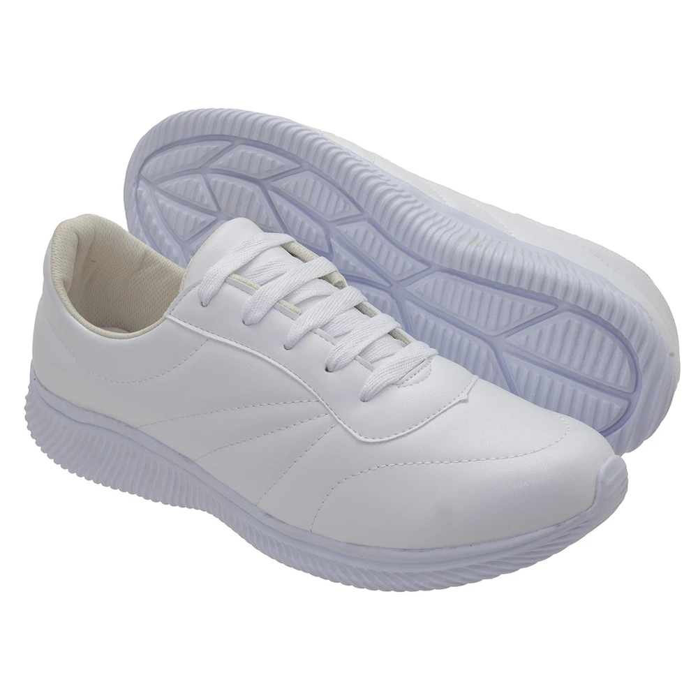 Tênis em couro ecológico e tecido com solado em borracha antiderrapante.
