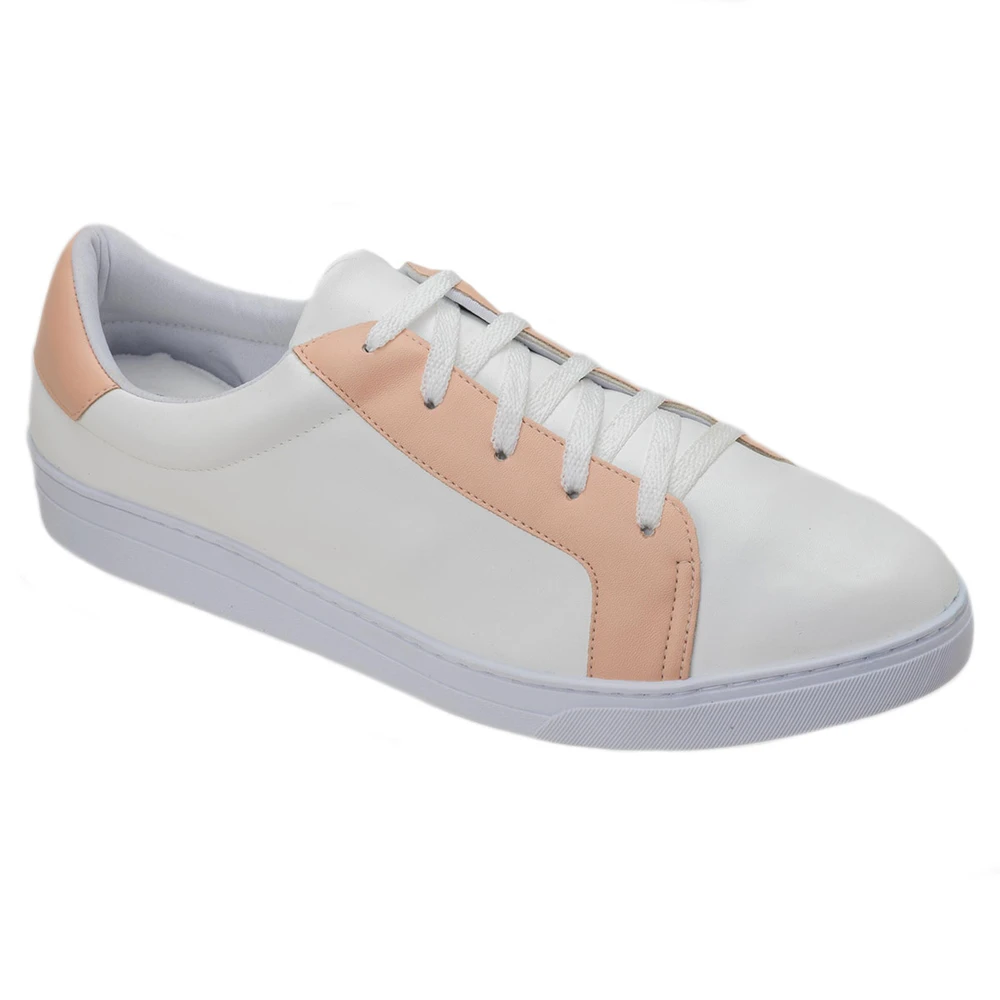 Tênis em couro ecológico e tecido com solado em borracha antiderrapante.