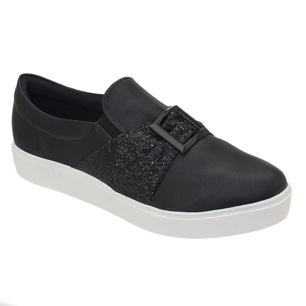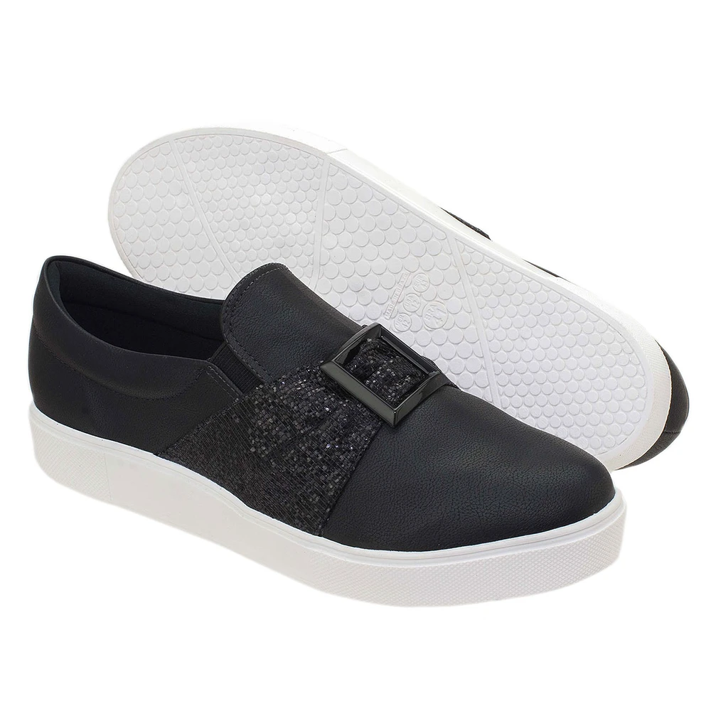 Tênis em tecido com detalhe em glitter e fivela. Com solado em borracha antiderrapante, muito confortável e versátil. Possui um solado de 2,5cm de altura