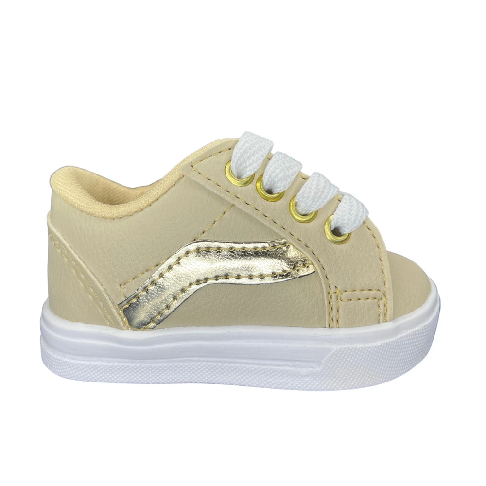 Tênis de bebê unissex Starzinho Bege com detalhe dourado, perfeito para os primeiros passos do seu pequeno com conforto e estilo. Seu design versátil combina com qualquer look, explorando o charme das listras metálicas que trazem modernidade ao produto. Fabricado com material macio e solado antiderrapante, oferece segurança e liberdade para os movimentos delicados do bebê. Ideal para uso diário, proporciona fácil calce graças ao cadarço ajustável. Um tênis que une durabilidade, conforto e visual sofisticado para acompanhar o crescimento do seu filho.