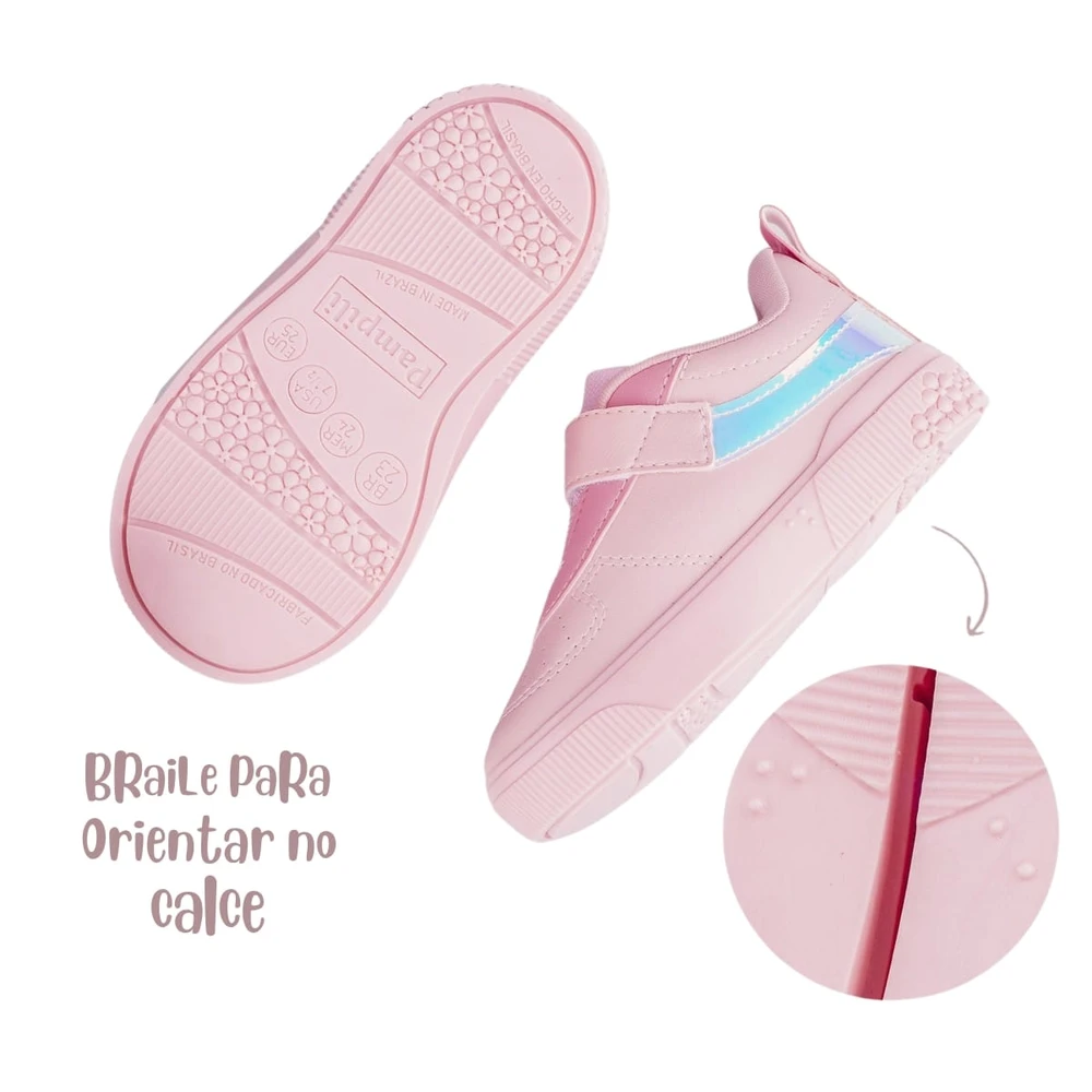Destaque especial para a escrita em braile em relevo, auxiliando crianças cegas ou com baixa visão a identificar o calçado direito e esquerdo. O fecho de contato e elástico facilita o calce, trazendo mais autonomia para as pequenas.