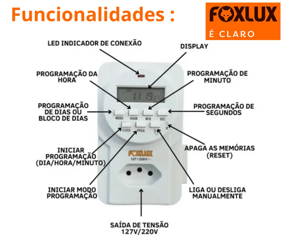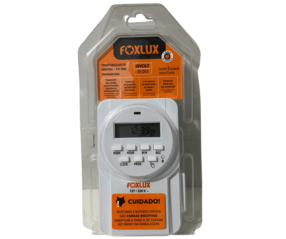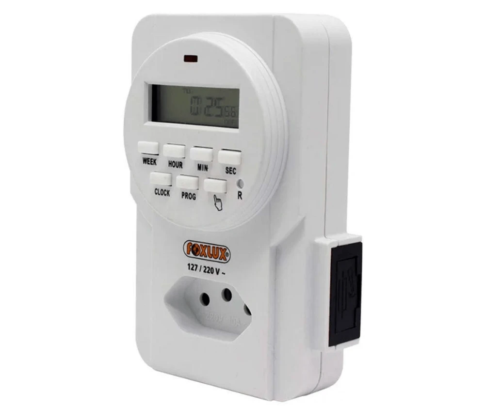 O Programador de Tempo Digital permite automatizar o funcionamento de equipamentos e sistemas elétricos. É fácil de programar e pode ser ligado diretamente à tomada elétrica. Utilizado para automatizar sistemas de iluminação, ventilação e aparelhos domésticos, como bebedouros e cafeteiras. Opera em frequência de operação: 50/60 Hz.