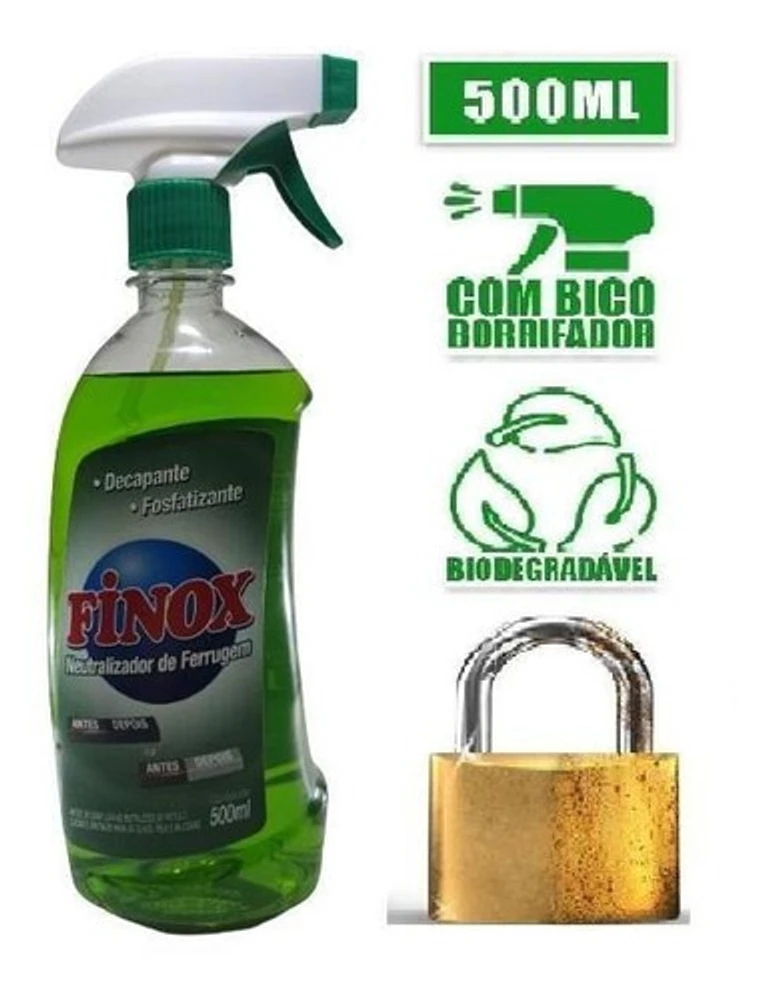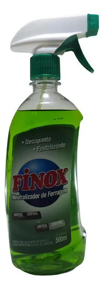 Removedor Neutralizador De Ferrugem Decapante FosfatizanteUm produto de tripla função com alta performance na remoção de ferrugem.Finox Ferrugem é um produto de tripla função: desengraxa, decapa e fosfatiza.Perfeito para eliminar a ferrugem e preparar a superfície para pintura, dispensando a utilização de outros produtos como removedores, fosfatizantes, entre outros.O Finox Ferrugem elimina a ferrugem e forma uma película que previne a corrosão e prepara a superfície para aplicação de tintas e vernizes.Pode ser aplicado em qualquer superfície que tenha ferrugem, seja ela ferro, zinco, cobre ou outros metais.O uso do Finox Ferrugem elimina totalmente a necessidade de lixamento e jateamento.Aplicações:Ofinox tira Ferrugem pode ser aplicado para tirar ferrugem de:Ferro;Zinco;Cobre;Inox;Ou qualquer outro tipo de superfície.Benefícios:Desengraxante;Decapante;Fosfatiza;Fácil aplicação;Elimina necessidade de lixamento e jateamento;Base de água;Biodegradável;Não necessita de EPI para aplicação;Pode ser aplicado com pulverizador, trincha, escovas, esponjas ou imersão, diluído 2x1 com água.