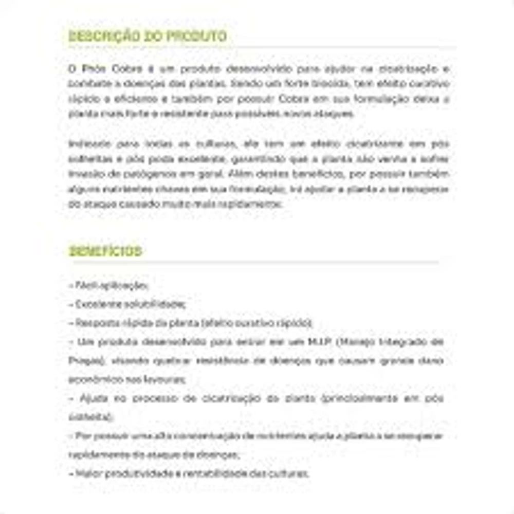 O Phós Cobre é um produto desenvolvido para ajudar na cicatrização e combate a doenças das plantas. Sendo um forte biocida, tem efeito curativo rápido e eficiente e também por possuir Cobre em sua formulação deixa a planta mais forte e resistente para possíveis novos ataques.