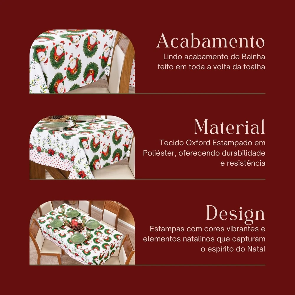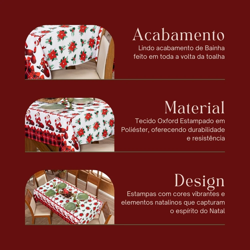 Adorne a decoração de sua cozinha com a Toalha de Mesa Estampada Natalina, ideal para criar uma atmosfera festiva em suas celebrações de fim de ano. Com dimensões de 2,20m x 1,40m, é perfeita para mesas retangulares de 6 lugares, adicionando um toque de charme e elegância às suas festas natalinas. Feita em tecido Oxford, a toalha oferece durabilidade e resistência, além de ser fácil de limpar e manter. O design natalino vibrante presente na toalha captura o espírito alegre do Natal, tornando-a uma escolha ideal para suas reuniões e celebrações de final de ano. Confira!