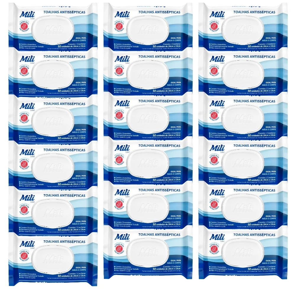 Embalagem com 18 pacotes de 50 unidades, totalizando 900 toalhas Experimente a praticidade aliada à segurança com as Toalhas Umedecidas Mili Antissépticas.