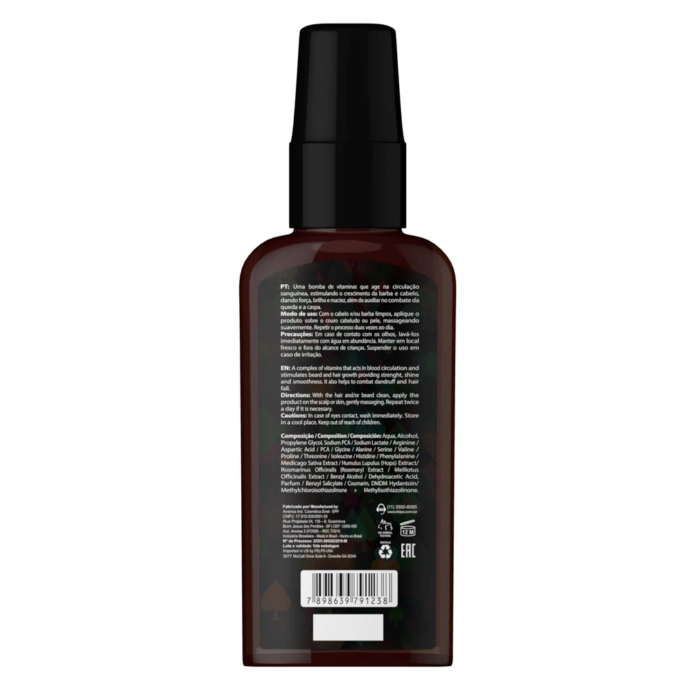 Com o cabelo e/ou barba limpos, aplique o produto sobre o couro cabeludo ou pele, massageando suavemente. Repetir o processo duas vezes ao dia.