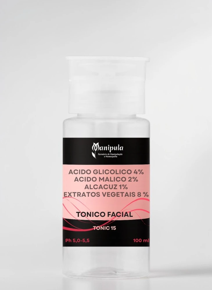 Ácido Glicólico 4% + Ácido Málico 2% + Alcaçuz 1% + Extratos vegetais (Hamamelis, Jaborandi, Calendula e Camomila) 8 % - Tonico facial qsp