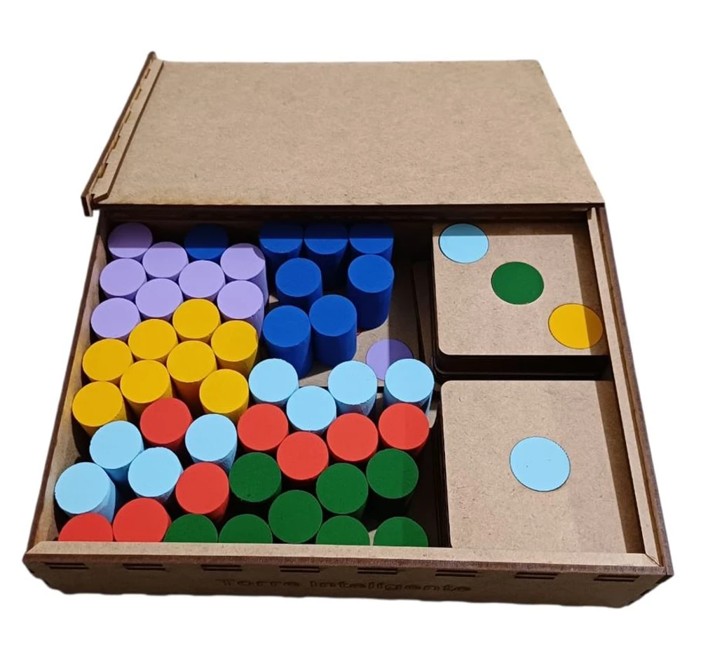 Estojo com 15 bases com marcações em cores diversas coincidindo com as cores dos 48 cilindros coloridos (Tinta Atóxica).