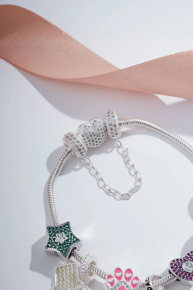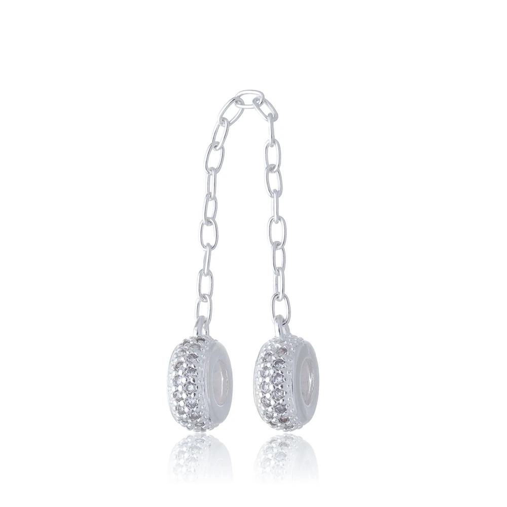 Trava de segurança cravejada com pavê de cristais com correntes conecta as duas partes da pulseira, garantindo que nenhum dos lados tenha alguma peça faltando por ter caído.