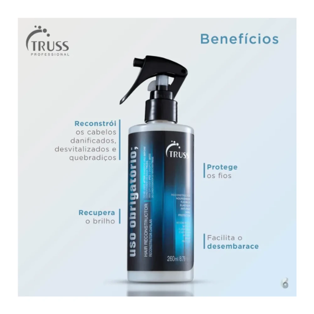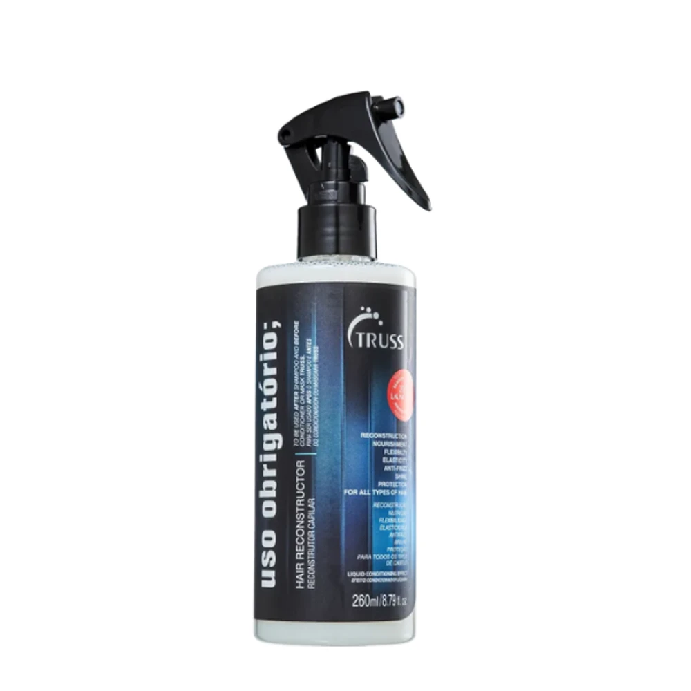 O Spray Reconstrutor TRUSS USO OBRIGATÓRIO é o produto ideal para elevar a beleza e a saúde do seu cabelo. Desenvolvido para todos os tipos de cabelo que buscam uma recuperação profunda e uma hidratação intensa, este spray oferece uma solução completa para restaurar a vitalidade dos seus fios.