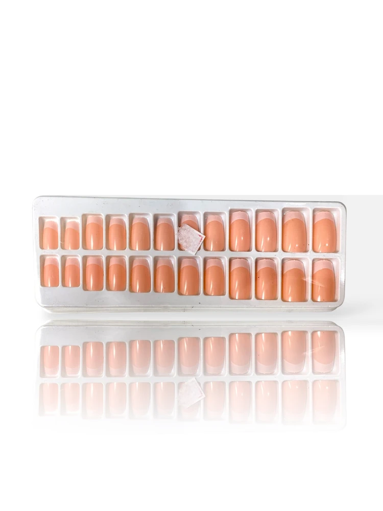Higienize e seque as unhas naturais. Escolha o formato e tamanho desejados, aplique cola ou adesivo próprio e pressione por alguns segundos até fixar.