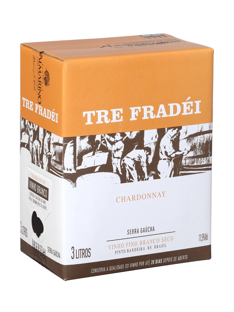 O vinho branco Valmarino Tre Fradéi Chardonnay Bag in Box é produzido pela Vinícola Valmarino, localizada em Pinto Bandeira-RS, na serra Gaúcha. Vinho elaborado com uvas 100% Chardonnay, de vinhedos próprios cultivadas na região de Pinto Bandeira - RS. A Bag in Box 3L equivale a 4 garrafas de 750 ml, sendo ideal para quem não costuma ou não quer beber todos os dias. Prático para servir pois não necessita de saca-rolhas.