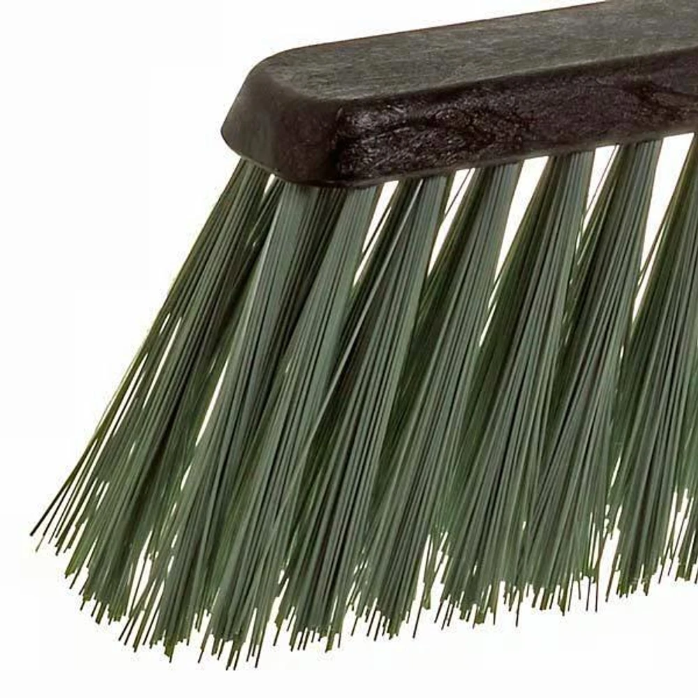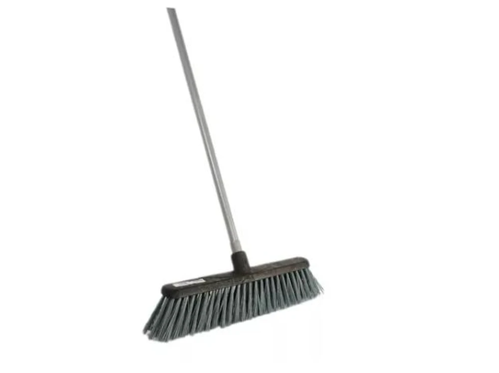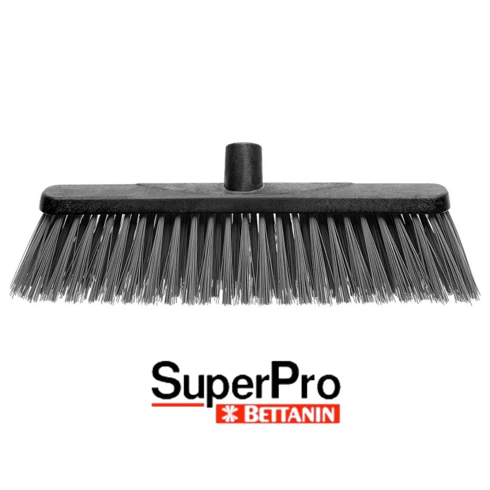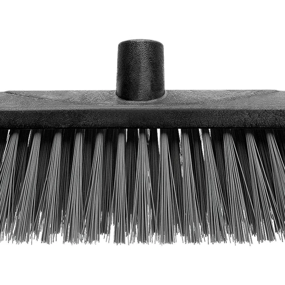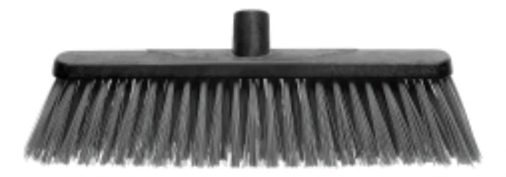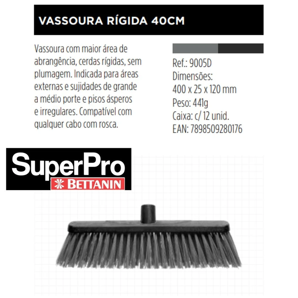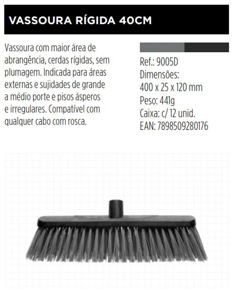 Vassoura de 40 cm com cerdas sintéticas e rígidas. Seu uso é indicado para varredura de sujeiras mais pesadas em pisos externos e pouco regulares.
