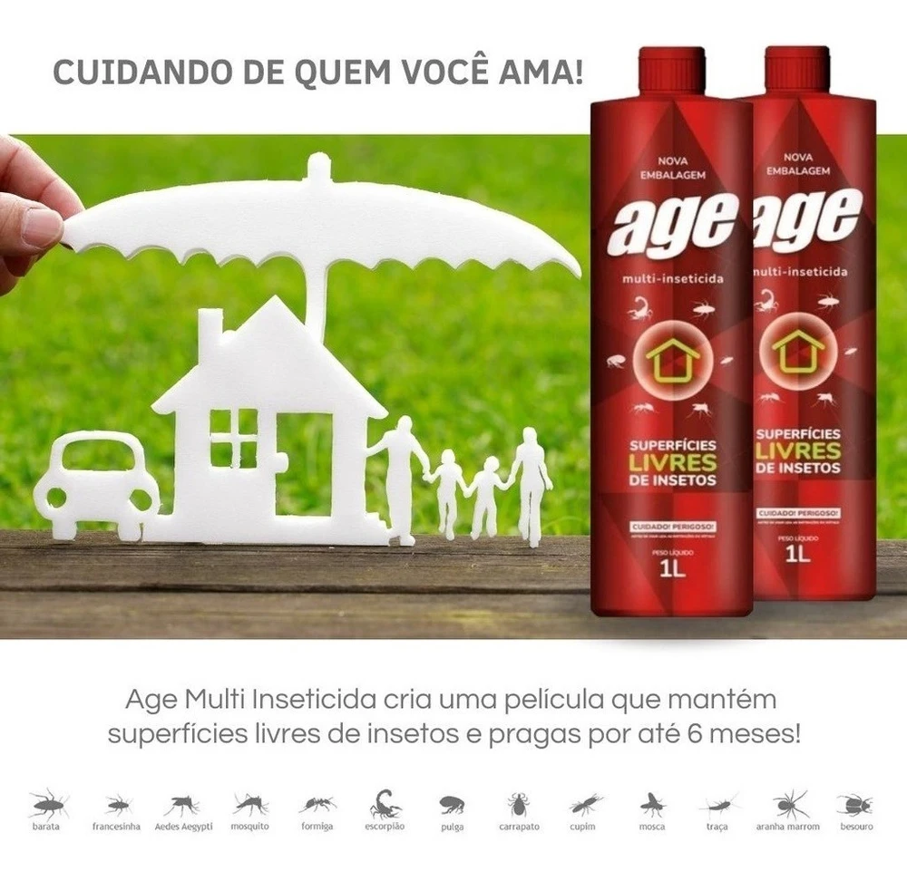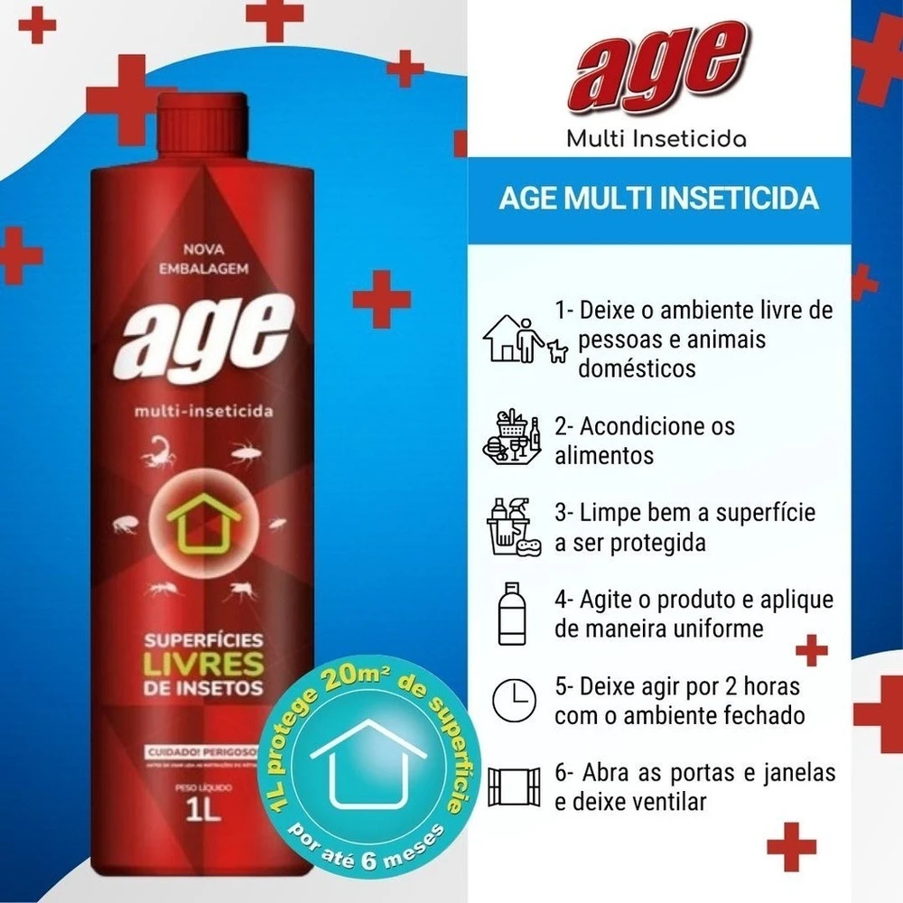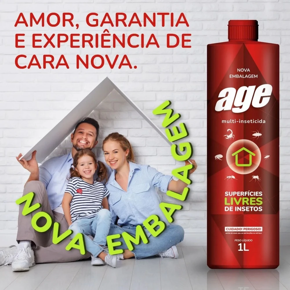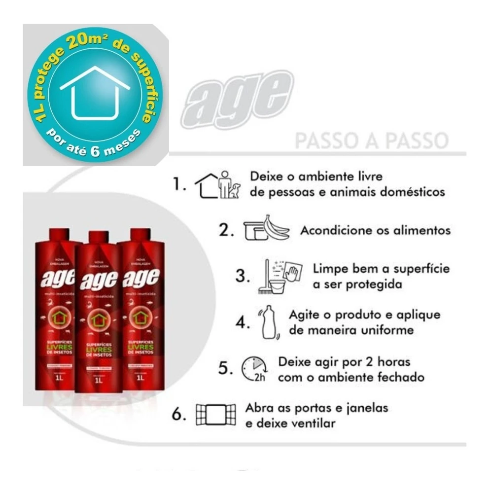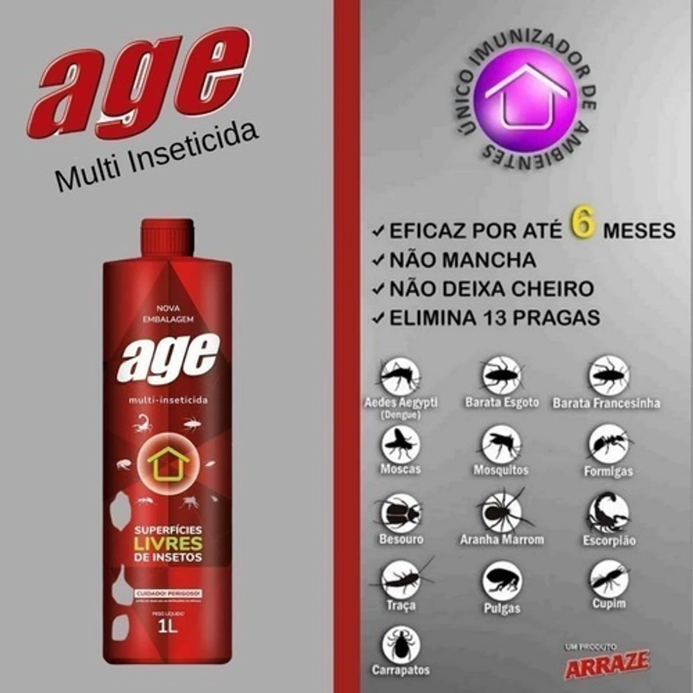 VENENO PARA BARATA E PRAGAS AGE 1L - Dedetizador e Inseticida 3x mais potente! Os produtos Arraze mudaram para Age. Leva água na formulação, portanto é menos agressivo que os tradicionais de mercado. Quase não tem cheiro. Ideal para áreas internas de residências, escolas e comércios em geral.BENEFÍCIOS- Ação tripla ( 3x )- Protege sua família de Mosquito da Dengue - Baratas - Pulgas - Carrapatos - Cupins - Formigas - Moscas - Mosquitos - Aranha Marrom - Pernilongos - Escorpião - Besouro - Traças- Leva água na formulação, portanto é menos agressivo que os tradicionais de mercado.- Aroma suave- Ideal para áreas internas de residências, escolas e comércios em geral.- Ação Residual - continua agindo no ambiente após a aplicação. ( Longa duração )- Não agride o meio ambiente- Não manchaINFORMAÇÕES TÉCNICAS- Durante a aplicação não devem permanecer no local pessoas ou animais;- Não reutilize a embalagem;- Não aplicar sobre alimentos e utensílios de cozinha, plantas e aquários; Tóxico para peixes. Não fume durante a aplicação; Guarde longe do alcance de crianças e animais domésticos; Em caso de intoxicação, procure logo um médico, levando a embalagem do produto;- Evite a inalação, contato com a mão e a pele. Em caso de contato direto com o produto, lavar a parte atingida com água e sabão em abundância. Mantenha o produto na embalagem original;- Não aplique o produto na presença de pessoas asmáticas ou com problemas respiratórios.- 1 Litro protege 20m² de superfície- Validade: 24 MESESMODO DE USAR:Pulverize nos locais onde os insetos vivem ou transitam como:Cantos, rodapés, armários, estantes, frestas de portas, batentes e tacos, embaixo de pias, móveis, fogões, geladeiras, carpetes, tapetes e ralos.Quando as aplicações se destinarem ao combate de insetos voadores (moscas e mosquitos), o produto deve ser pulverizado sobre todas as superfícies onde esses insetos pousam como o Chão, paredes e tetos.