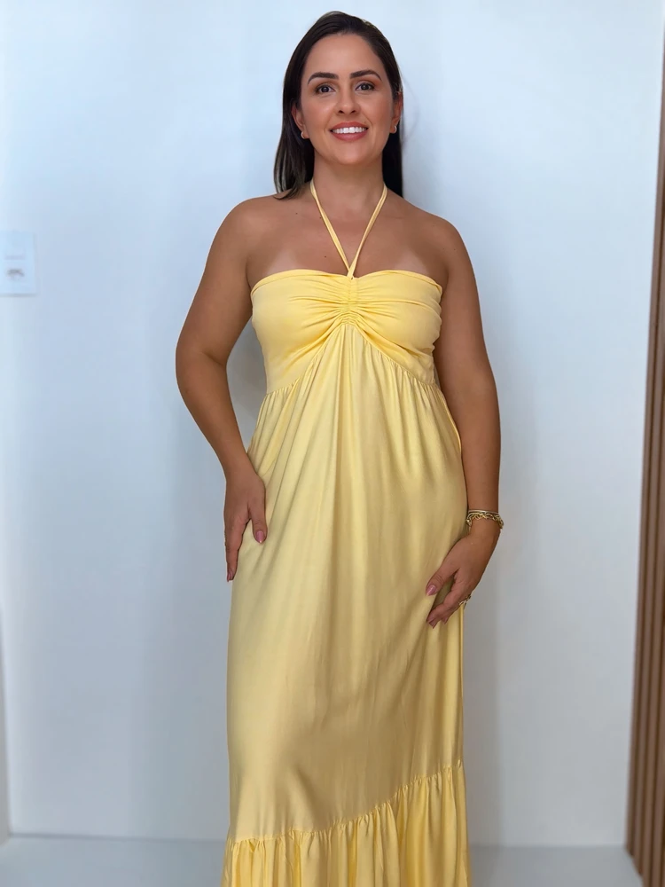 O Vestido Alana Longo é a escolha perfeita para quem ama um visual sofisticado com toque de delicadeza. A amarração no pescoço valoriza o colo e permite ajuste ideal ao corpo, enquanto a modelagem fluida garante movimento e um caimento impecável.