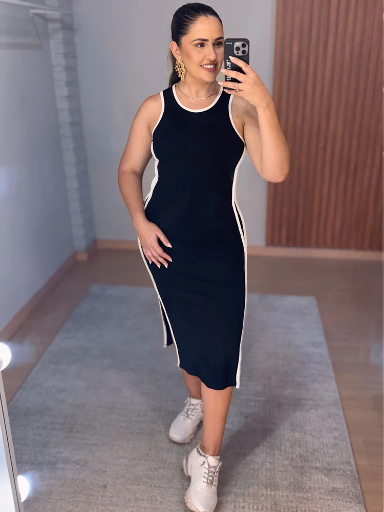 A modelagem midi com corte reto alonga a silhueta e traz um ar contemporâneo à peça. O decote arredondado e as cavas mais amplas garantem praticidade e conforto, enquanto os recortes laterais contrastantes criam um efeito visual que valoriza o corpo e adiciona um toque esportivo e urbano ao design.