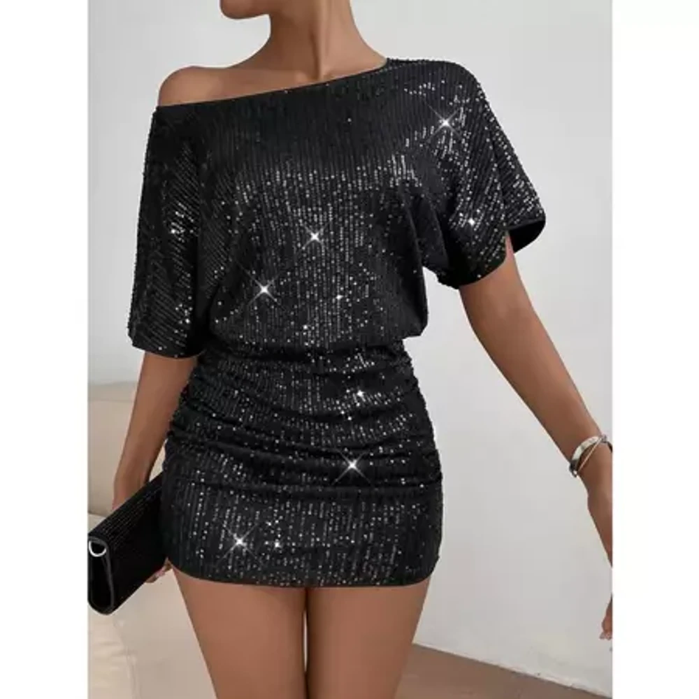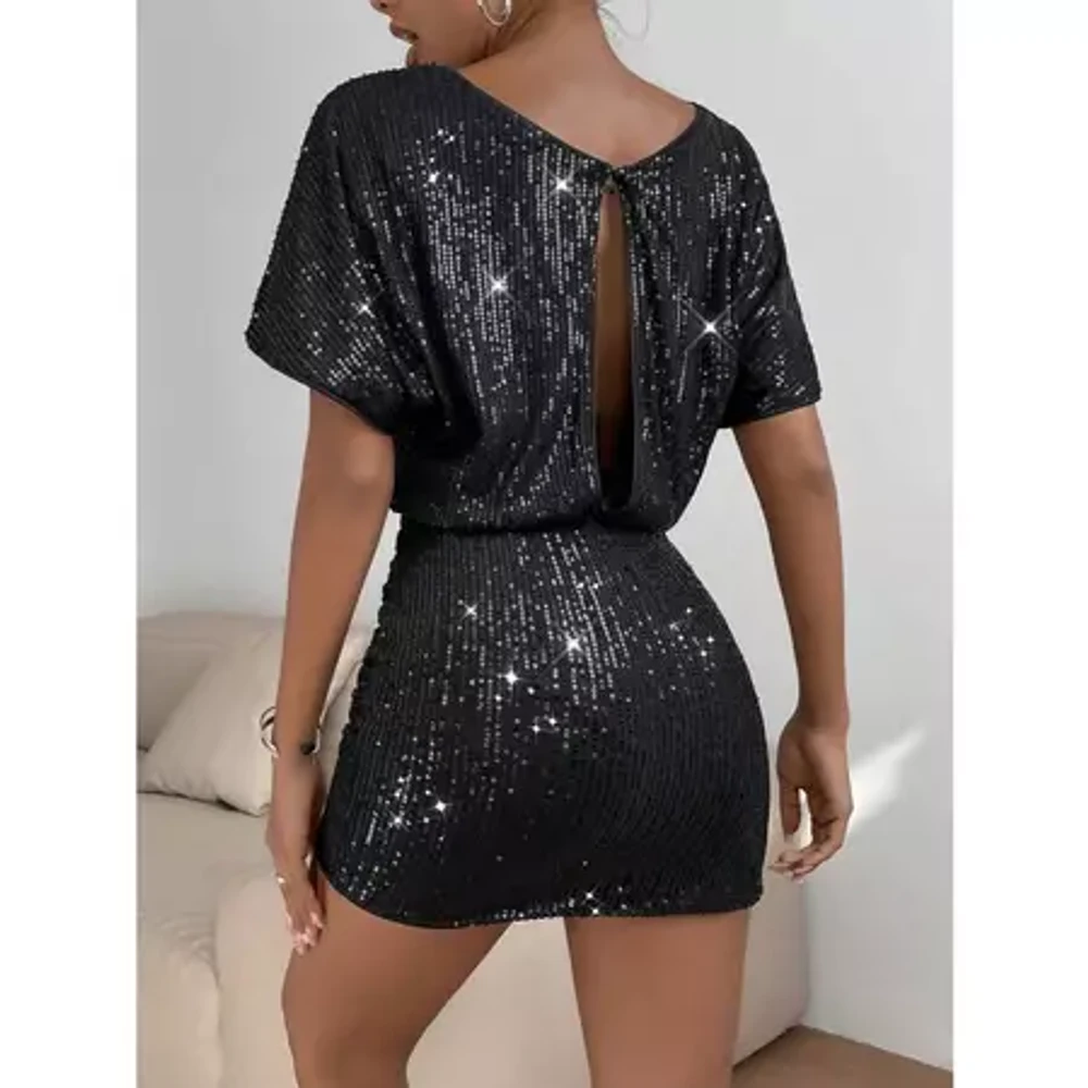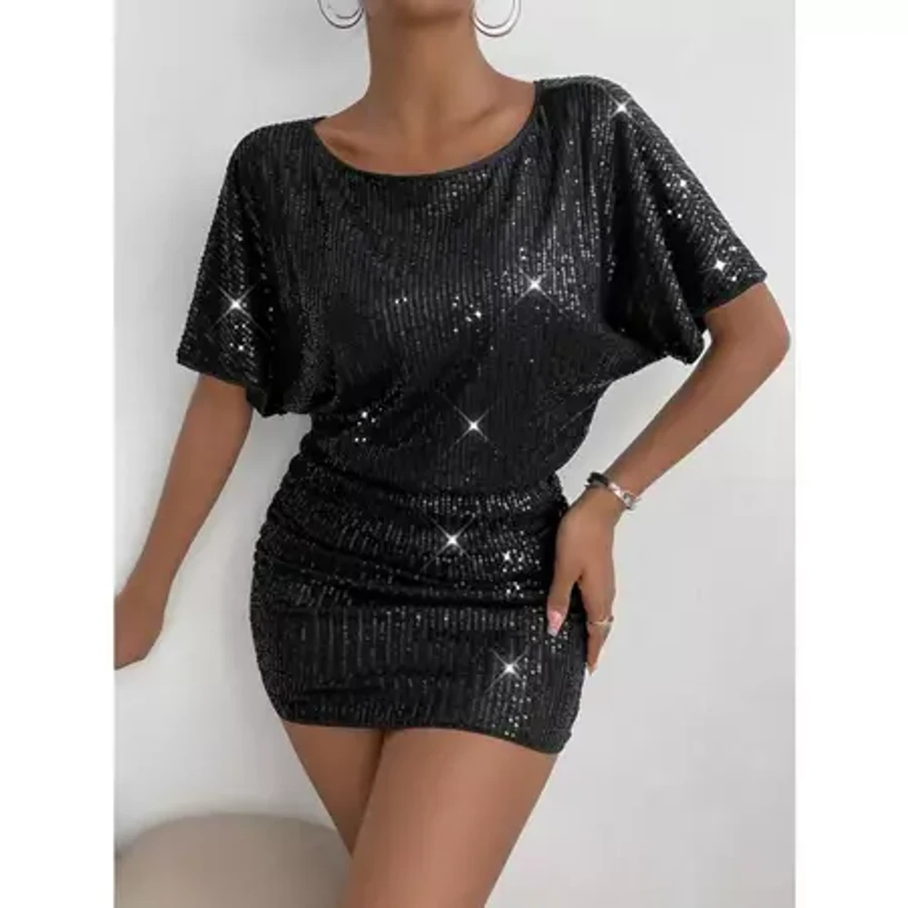 Vestido Curto Festa Brilho Paetês Lantejoulas Manga Curta Moda Blogueira Preto SH D729