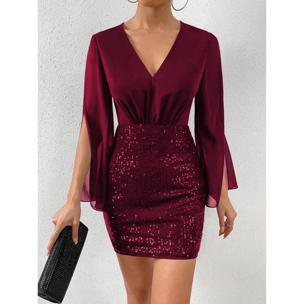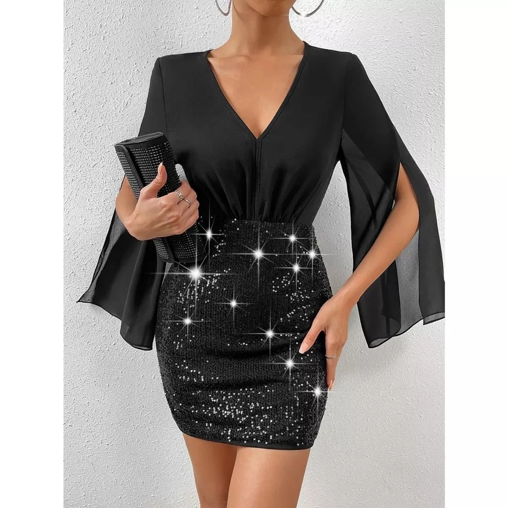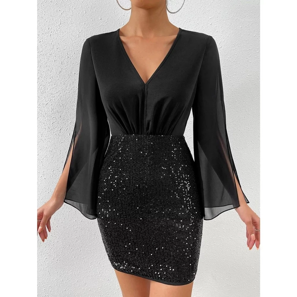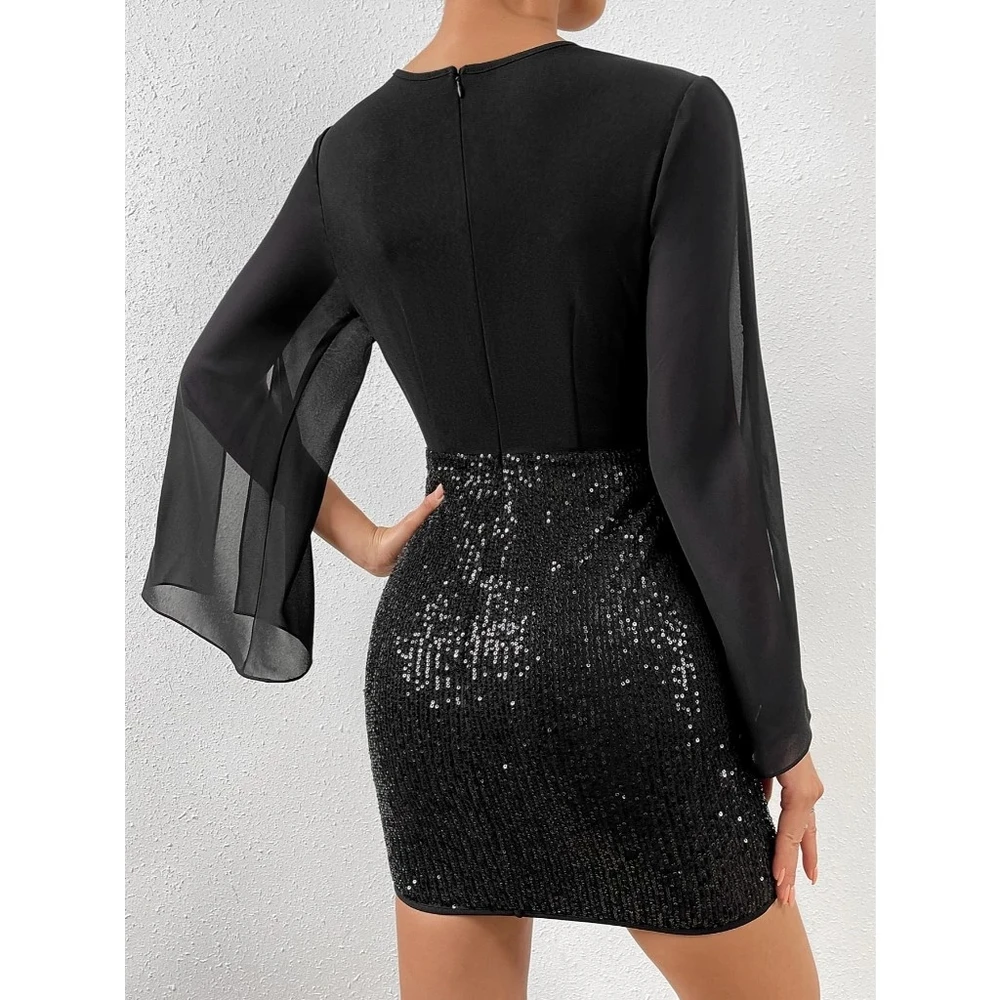 Vestido Curto Festa Brilho Paetês Lantejoulas Manga Longa Elegante Preto SH D465