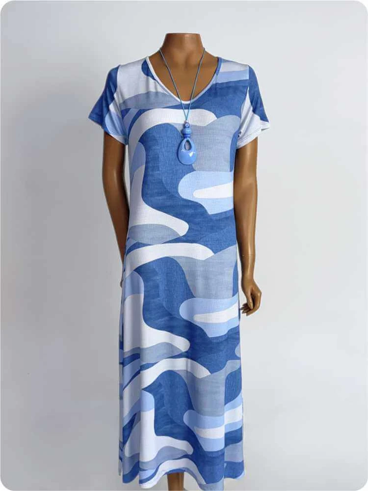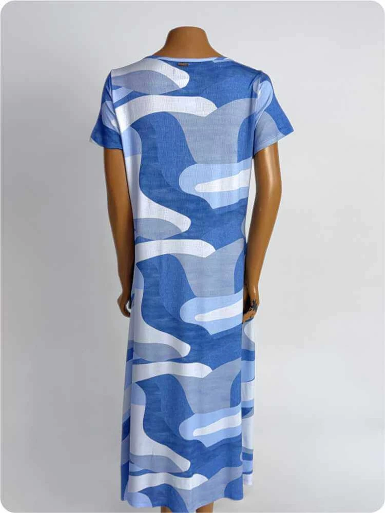 Vestido Feminino Azul Manga Curta Estampa Camuflada, com bolsos e fenda nas laterais