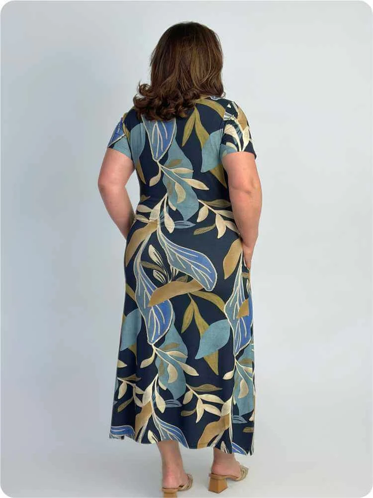 Vestido Feminino Azul Marinho Estampa Folhagem Tropical, com bolsos e fenda nas laterais.