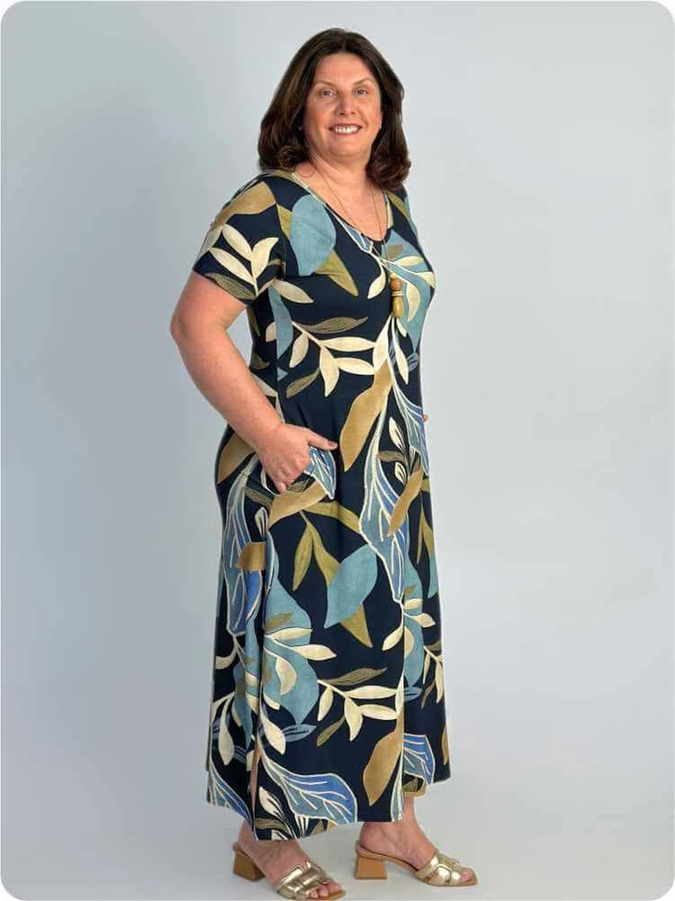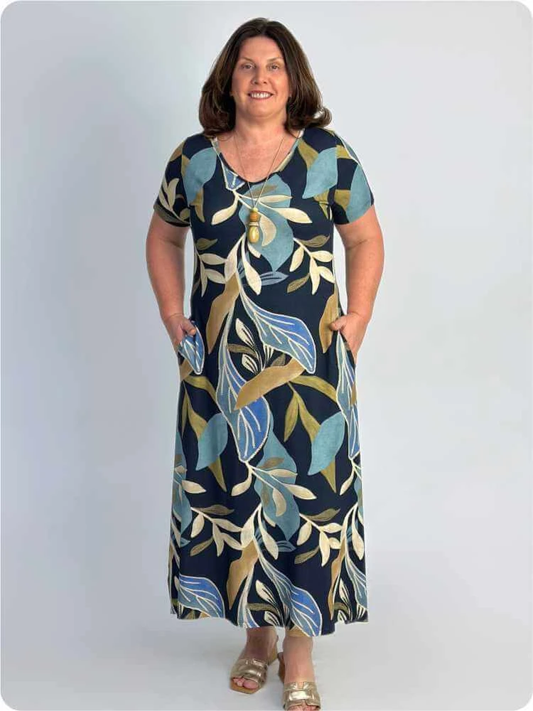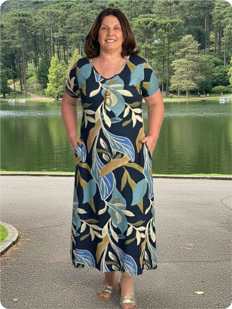 Descubra o conforto e a elegância do vestido feminino azul marinho com estampa de folhagem tropical, perfeito para mulheres que buscam estilo e praticidade no dia a dia. Confeccionado em tecido leve e de alta qualidade, este vestido longo proporciona caimento fluido que valoriza todos os tipos de corpo. Ideal para passeios, eventos informais ou momentos de lazer, ele traz bolsos laterais para máximo conforto e funcionalidade. Sua estampa exclusiva com tons de azul, bege e verde cria um visual fresco e sofisticado, combinando perfeitamente com sandálias e acessórios neutros. Aposte em um look versátil que une beleza e praticidade, realçando sua confiança e personalidade em qualquer ocasião.