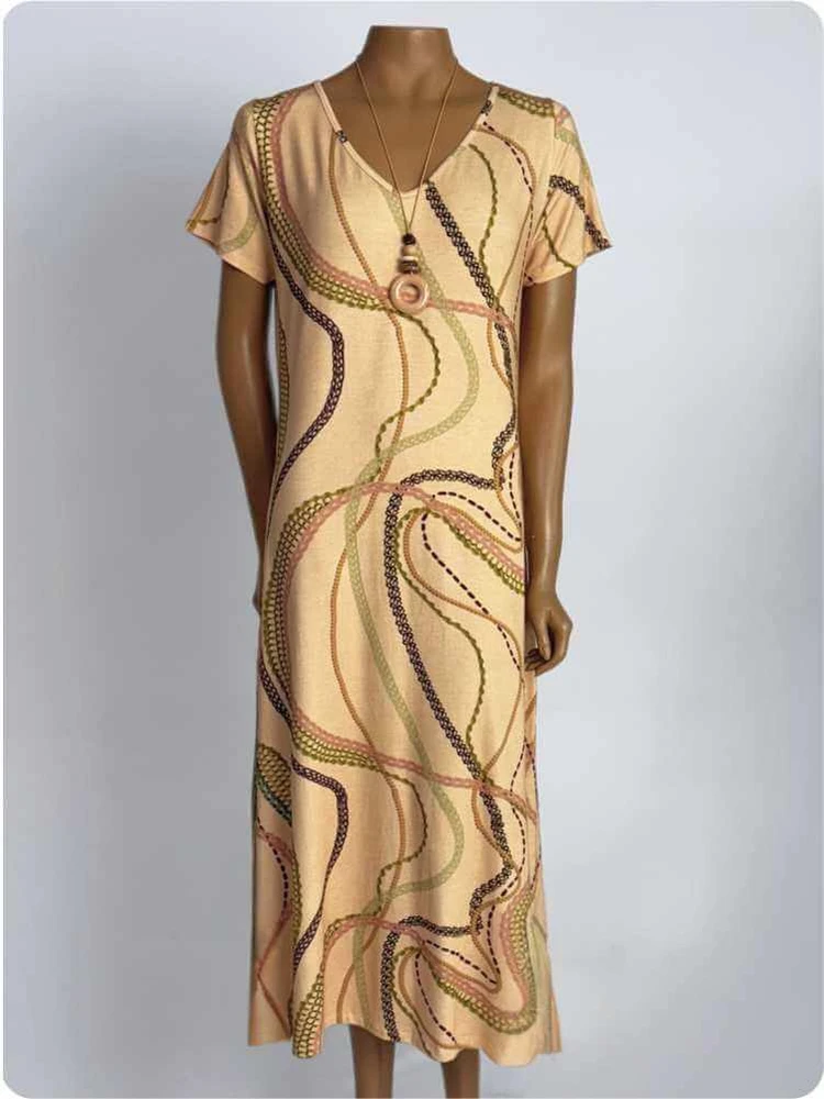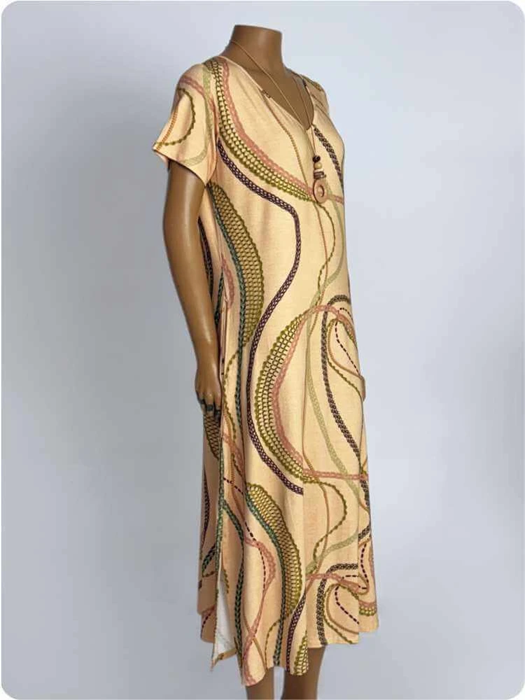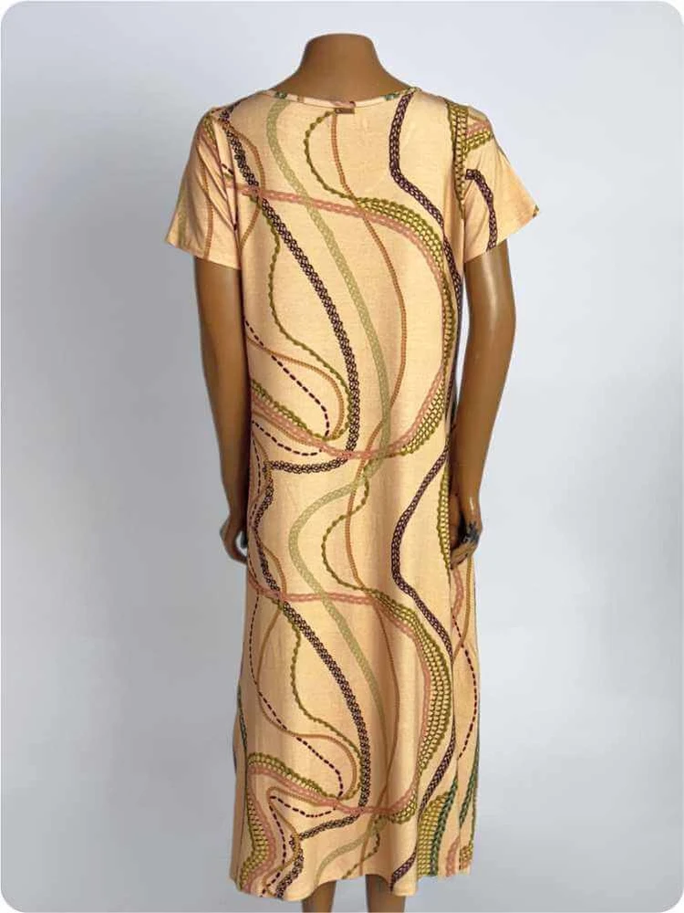 Vestido feminino midi em malha leve, perfeito para quem busca conforto e estilo no dia a dia. A modelagem com manga curta e decote em V valoriza a silhueta, enquanto a estampa exclusiva em tons de bege com detalhes em verde e preto adiciona um toque moderno e sofisticado. Ideal para ocasiões casuais ou eventos informais, proporciona liberdade de movimento com um caimento fluido que se adapta a diferentes corpos. Sua malha de alta qualidade oferece toque macio e excelente durabilidade, sendo fácil de cuidar e combinar. Um vestido versátil que alia elegância e praticidade, perfeito para mulheres que desejam renovar o guarda-roupa com uma peça atemporal e diferenciada.
