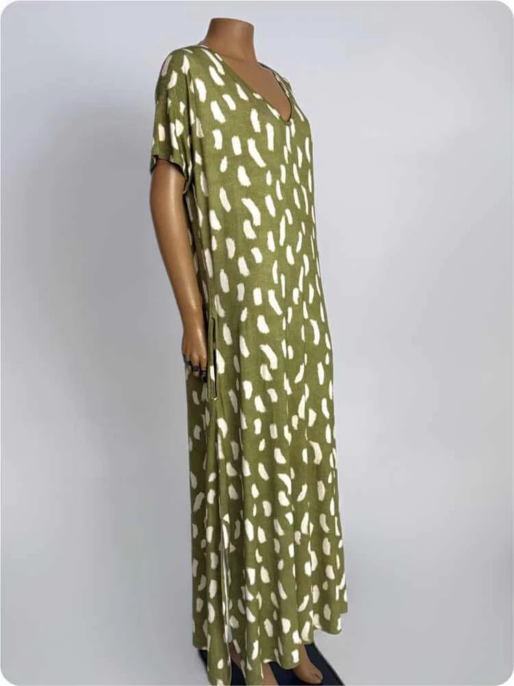 Vestido Feminino Midi Verde Oliva Estampado em Malha, com bolsos e fenda nas laterais