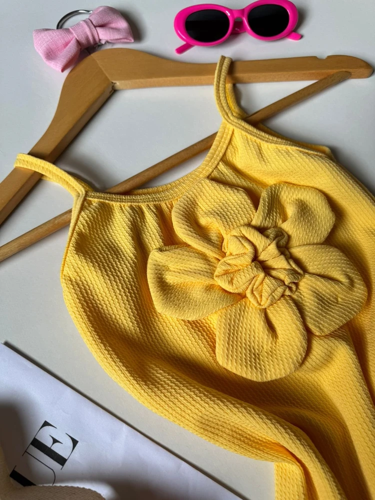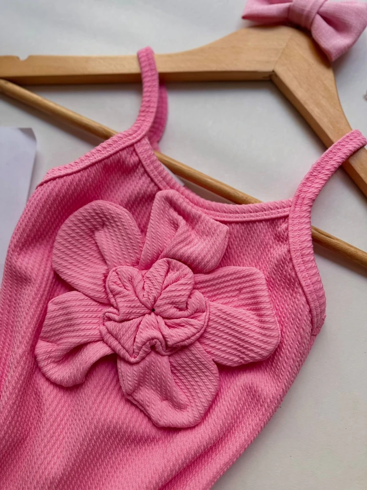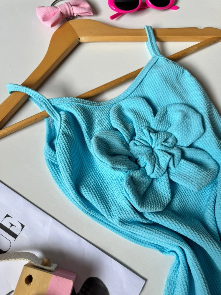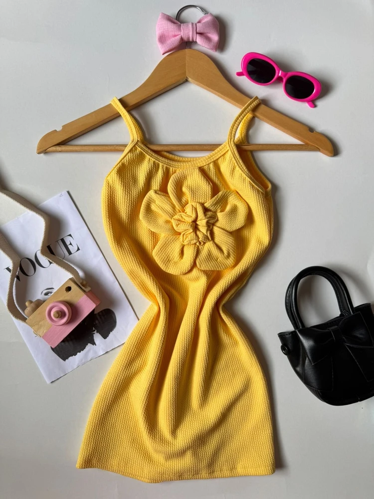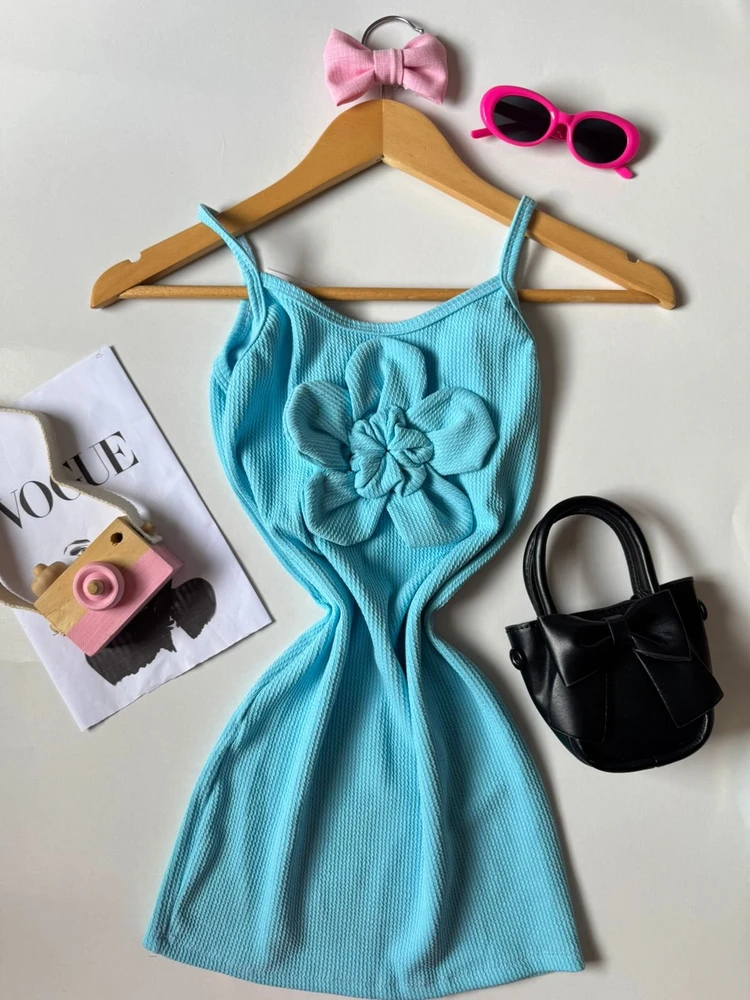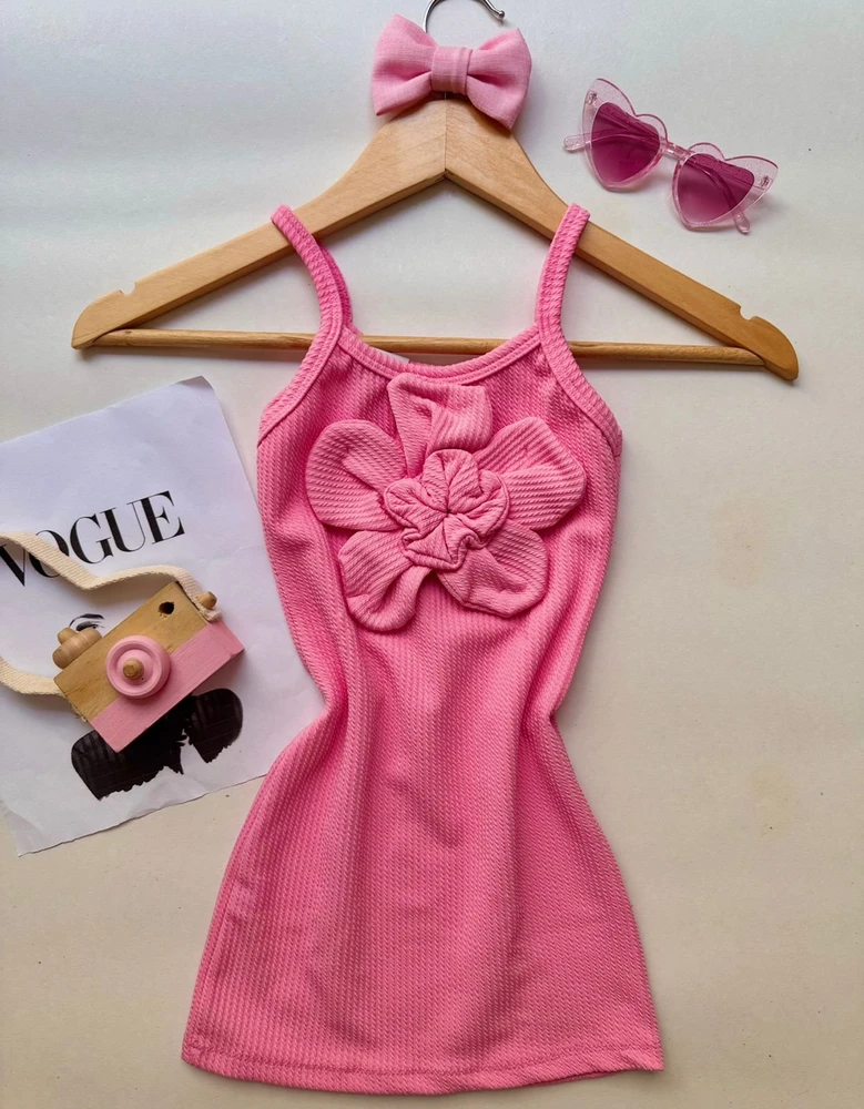 Com alcinhas e uma flor na parte frontal que é um charme a parte, o vestido confere um visual delicado e moderno ao mesmo tempo.