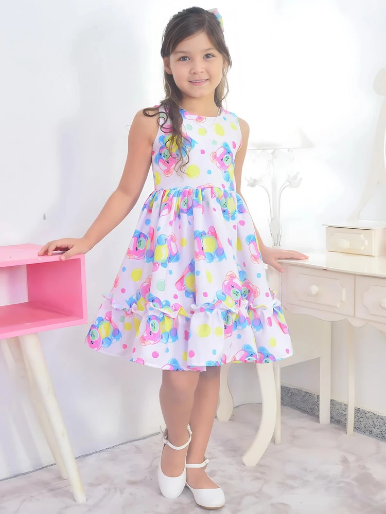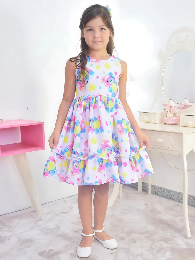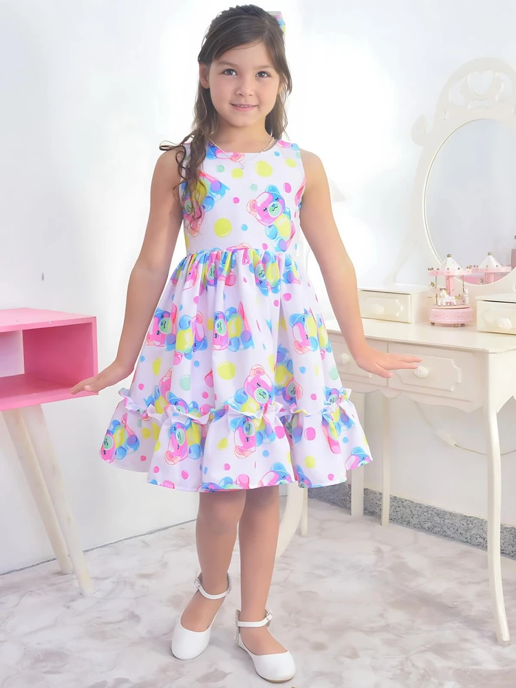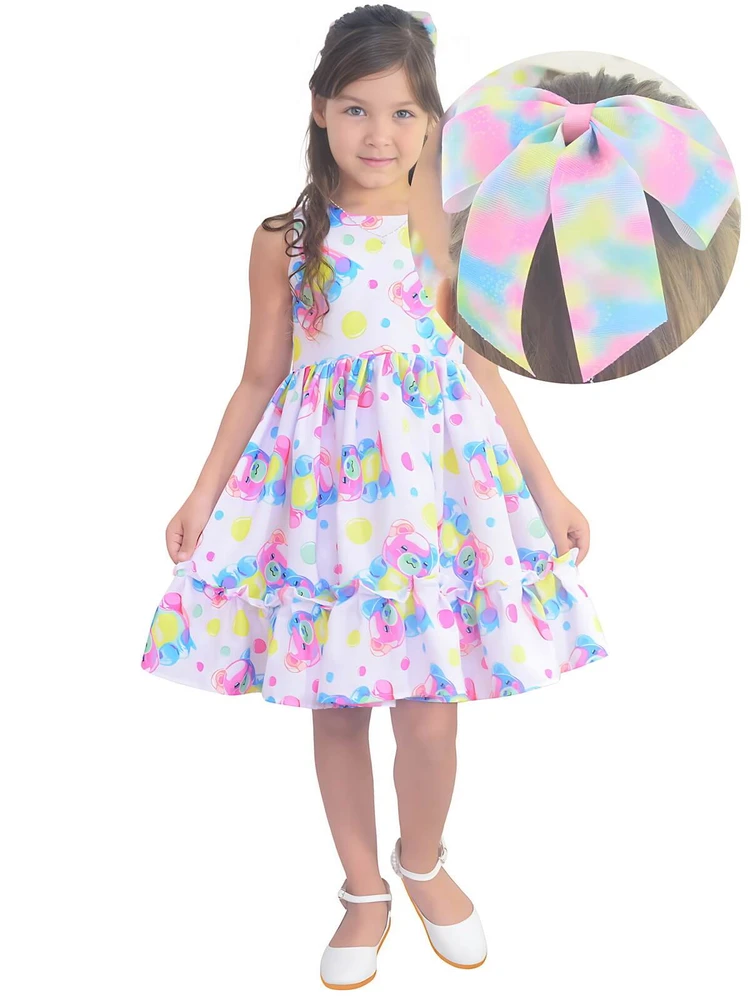 Transforme passeios, festas e comemorações em momentos ainda mais alegres com o encantador Vestido Infantil Ursinhos Neon. O modelo combina o charme dos babados rodados com uma estampa divertida de ursinhos coloridos em estilo neon e bolinhas vibrantes, criando um visual único e cheio de personalidade para meninas que adoram se destacar.