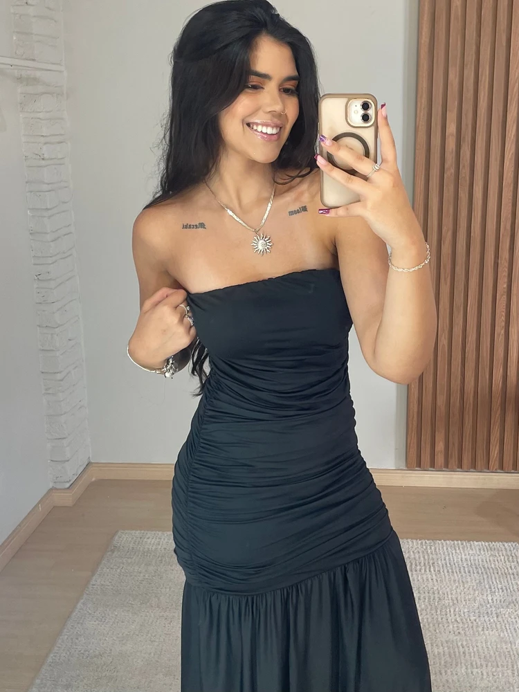 A parte superior traz o clássico tomara que caia, com efeito drapeado que cria linhas suaves e alongadas, garantindo sustentação e um visual refinado. A região do quadril possui leve franzido estratégico, realçando a silhueta sem marcar, enquanto a saia fluida em comprimento midi traz movimento e leveza a cada passo.
