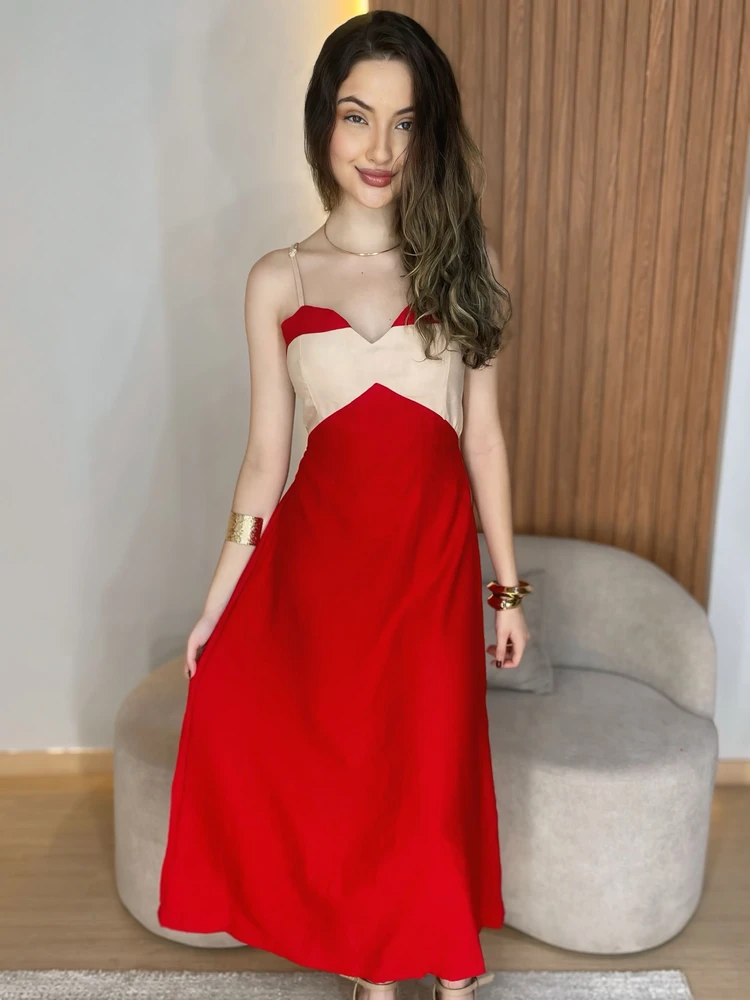 O Vestido Longo de Alça Fina com Amarração nas Costas da Andy é perfeito para mulheres que querem unir delicadeza e impacto num único look. O modelo bicolor alonga a silhueta, e o detalhe nas costas — com amarração regulável — valoriza a feminilidade de forma leve e sofisticada.