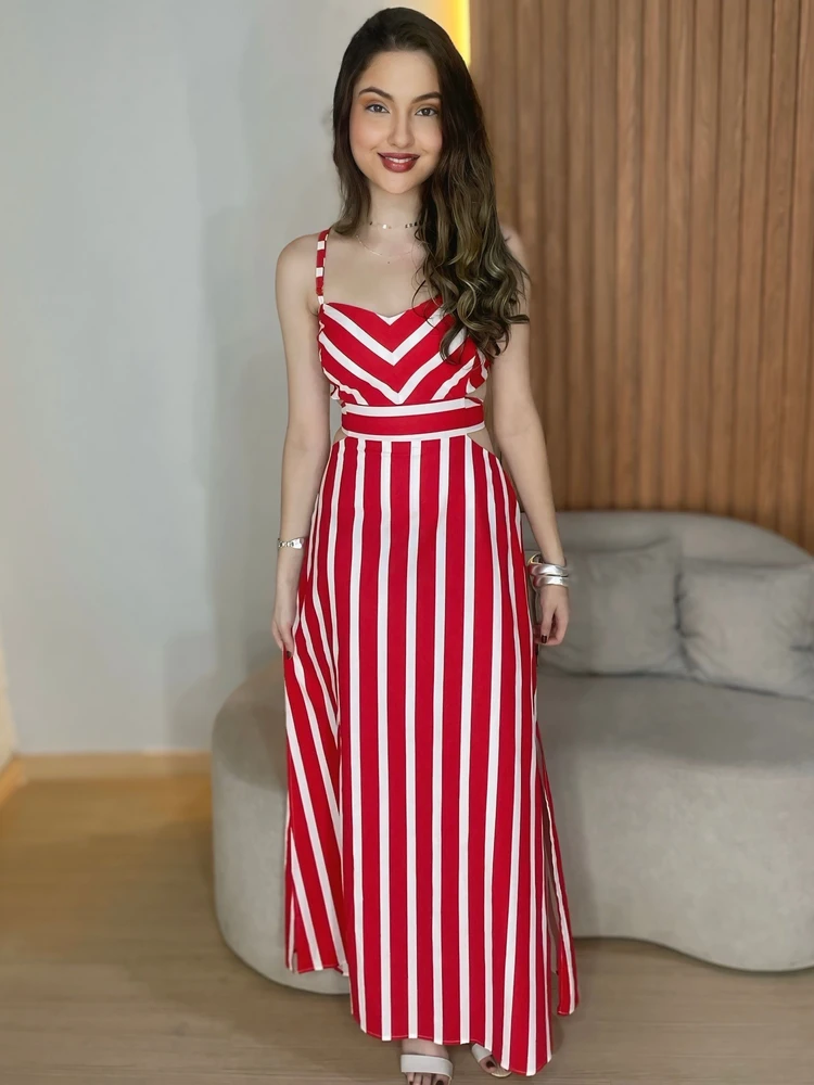 O Vestido Longo Listrado da D I W Modas foi criado pra mulher que gosta de estilo com personalidade. As listras verticais ajudam a alongar o corpo visualmente, enquanto os recortes laterais trazem sensualidade com elegância. E pra completar: a fenda frontal dá movimento e atitude ao look.